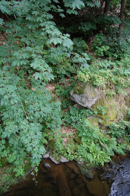 ![]() Eine kleine geologische Sehenswürdigkeit: Ein Lamprophyrgang, in diesem Fall Kersantit.