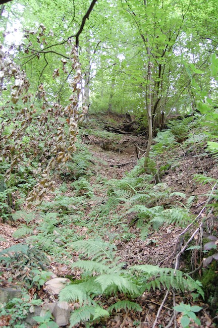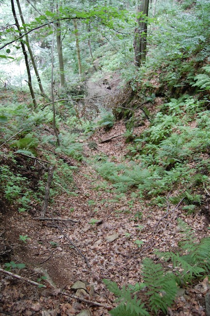 ![]() Der Aufstieg zum Fahle Laus Stolln. Dieser Stolln ist heute nur noch von der Edlen Krone erreichbar, weil dessen Mundloch von der Bergsicherung verwahrt wurde.