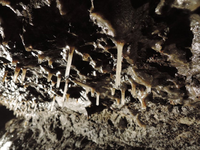![]() Wo Wasser tropft, findet man auch Aragonit- „Tropfsteinchen“ an der Firste.