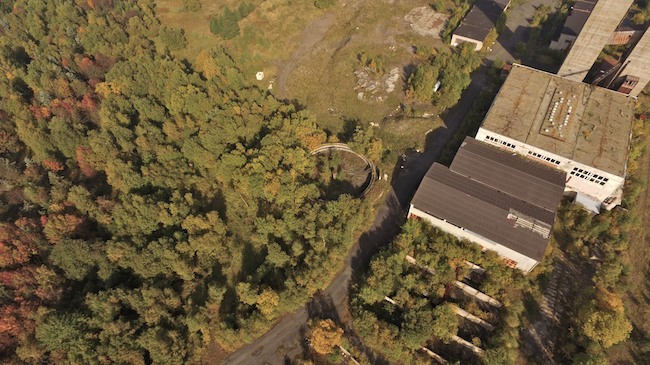 ![]() Ansicht aus Richtung des Kupferhübels: Zufahrt zur Grube Kupferberg / Mĕdĕnec, Im Hintergrund rechts der Schornstein des Heizhauses. Foto: Martin Planitzer & Diana Lichtenthal |