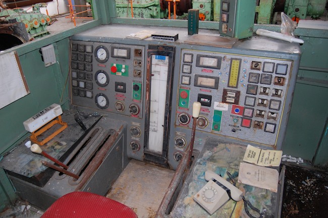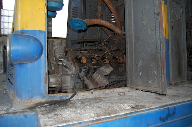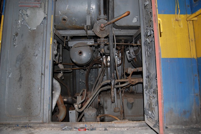 ![]() Nicht nur die Motoren und die elektrischen Einrichtungen fehlen sondern sogar die Zylinderköpfe samt Büchsen und Kolben wurden ausgebaut. |