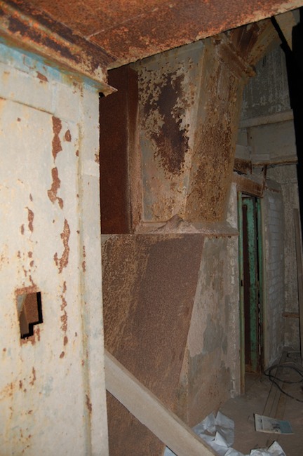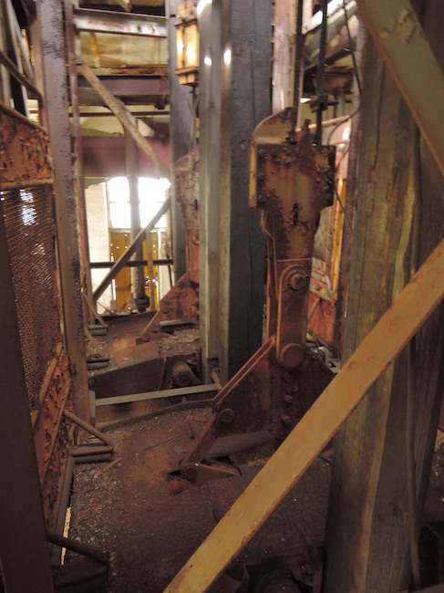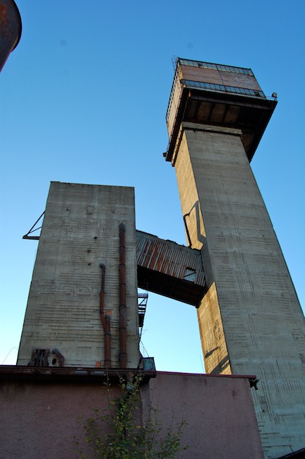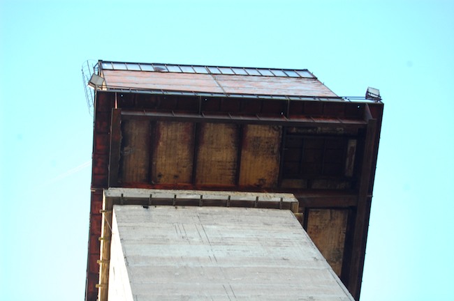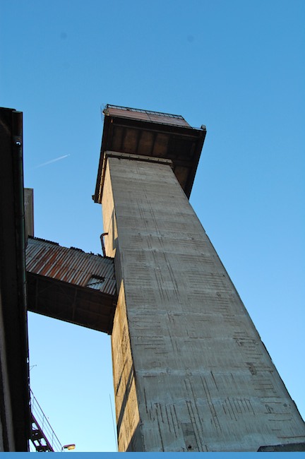![]() Ein Teil der Entleerungseinrichtung für den Skip. Diese eckige Blechröhre führte in den neben dem Förderturm liegenden turmartigen Anbau mit der Vorselektion und diversen Bandbrücken hin zu den verschiedenen Aufbereitungsstufen. |