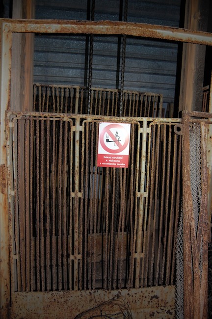![]() Die Gestelle waren recht eng und boten höchstens 6 Leuten Platz. Die Gestelltüren ließen sich sogar während der Seilfahrt öffnen; zum „Betrachten“ des Schachtausbaus. Foto: Denise Oehme & Mario Poller |