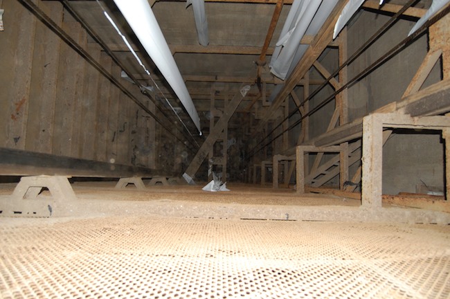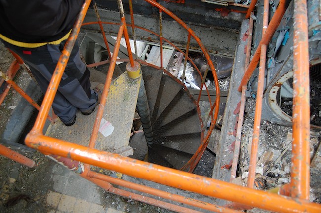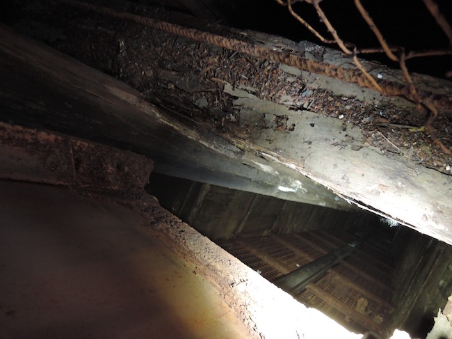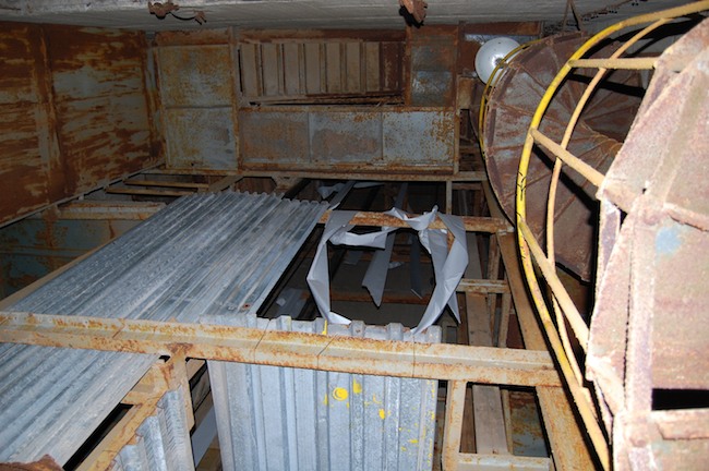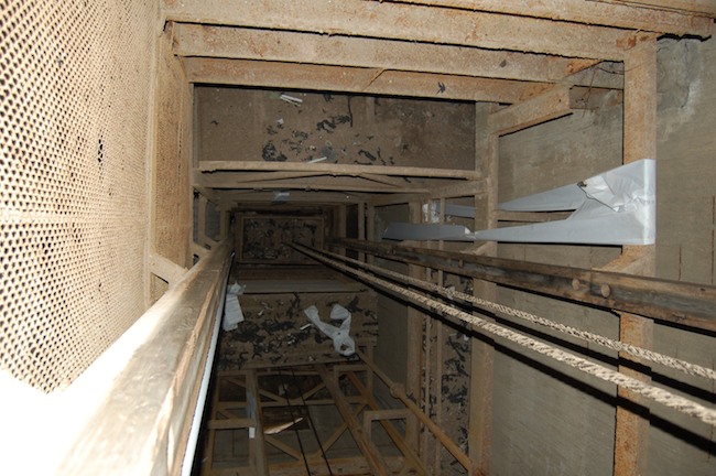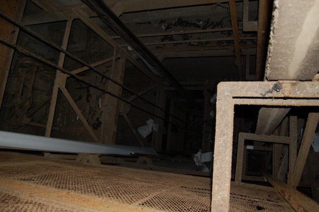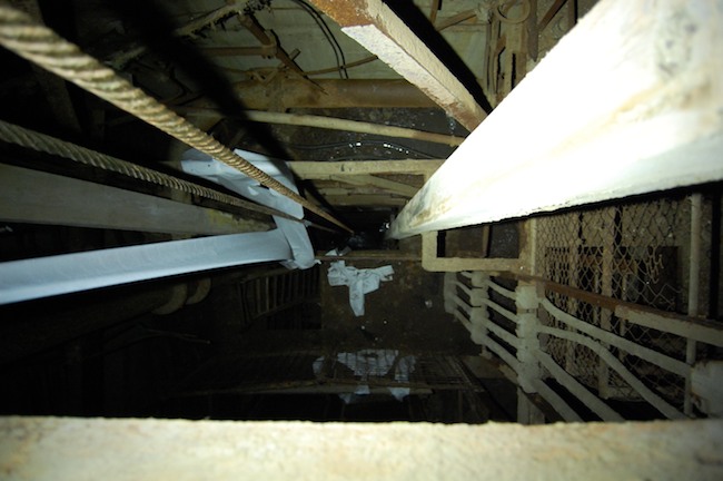 ![]() Blick in das Fördertrum. Der Schacht ist nach unten hin dicht. Die umherhängenden Papierstreifen stammen vom Fahrtenschreiber der Fördermaschine und sind von Chaoten in den Schacht geworfen worden. |