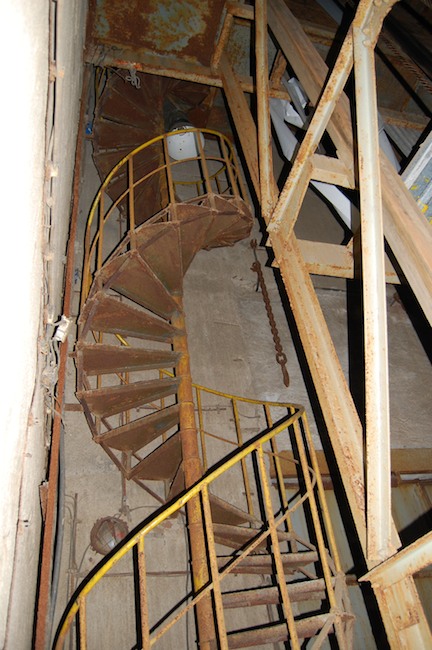 ![]() Über diese Wendeltreppe erreichte man die Ebene mit der Fördermaschine, doch zuvor lag noch eine Zwischenebene, auf der die Bremsanlage der Fördermaschine stand. |