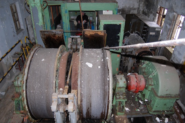 ![]() Wir befinden uns nun im Förderhaus hoch oben auf dem Förderturm auf dessen unterster Etage. Im Hintergrund der Aufzug für den Maschinisten – Tür steht offen – hier befindet sich auch die technische Ebene unter der Fördermaschine. |