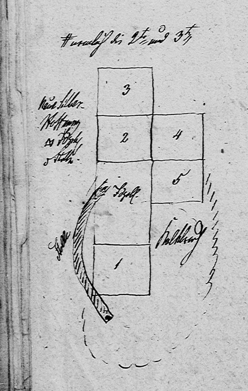 Wie oben zu lesen stand, war der Graben mitsamt dem zu seinem Unterhalt nötigen Weg eine halbe Ruthe breit. Nehmen wir mal eine Sächsische Feldmesserrute = 15 Fuß ≈ 4,3 m zur Grundlage, dann wären beide zusammen also reichlich 2 m breit gewesen. Das kommt hin. |