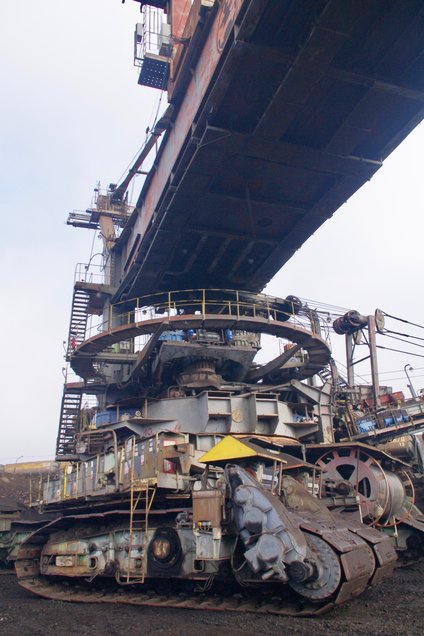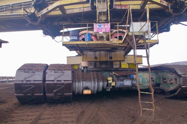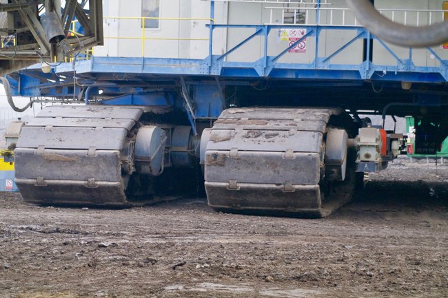 ![]() Die "Reifen": Der Schaufelradbagger verfügt über ein mehrteiliges Kettenfahrwerk. Foto: R. Gumprecht