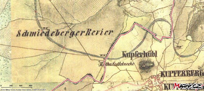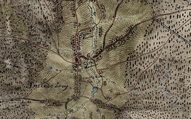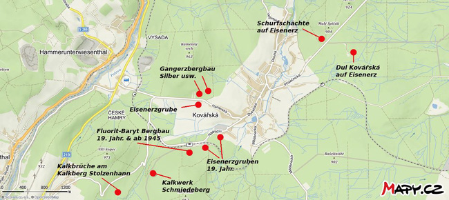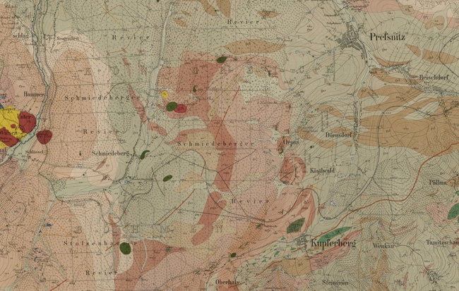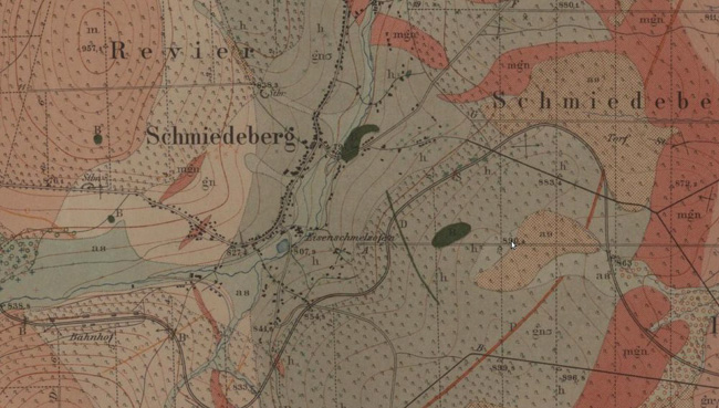 Die Eisensteingrube am Hammerberge. „In dem Hammergebirge sind gleichfalls einige Eisensteingruben befindlich, von welchen aber, bei meiner Reise im Jahre 1798, nur die sogenannte Franciscizeche im Umtriebe war. Diese Grube ist zu Gunsten des zur K. Kameralherrschaft Presnitz gehörigen Schmiedeberger Hohofens bereits im Jahre 1735 belegt worden. (Kameralherrschaft = direkte Verwaltung durch die Hofkammer. Verwaltungsform aus dem 15. bis 19. Jahrhundert in der k. u. k. Monarchie, die den sächsischen Domänen vergleichbar ist – Anm. d. Red.) Die Grube befindet sich an dem südlichen Abhange des Gebirges, der dem Dorfe Schmiedeberg zufällt. Das Gebirge selbst ist durch einen tiefen Stollen aufgeschlossen, welcher von dem Schwarzwasser, unweit der Schmiedeberger obern Mühle, in das Gneissgebirge getrieben worden. Er ist sehr winklich. Die an dem Mundloche genommene Stunde war St. 12,6, seine Hauptrichtung ist St. 1,3 nordwärts, bringt etwas mehr als 16 Lachter seigere Teufe ein, und war, bis zu dem J. 1795, 261 Lachter angefahren. In der 82sten Lachter ist auf demselben ein Schacht 6 ¼ Lachter tief niedergebracht worden. In der 111ten Lachter überfuhr man mit ihm ein schwaches (7 bis 8 Zoll starkes) rothes Lettentrumm, das sein Streichen St. 3 hatte, und in welchen etwas Glaskopf lag. Da man hoffte, dass dieses Lettentrumm mächtiger werden, und zugleich sich veredlen dürfte, so verfolgte man dasselbe mit der Stollenstrecke 70 Lachter weit. Da aber der Erfolg dem Wunsche nicht entsprach, so bemühete man sich, den sogenannten Franciscigang durch eine veränderte Richtung des Stollentriebes (St. 19,4 nordwestwärts) zu erreichen, welches auch in der 186sten Lachter geschah. Man verfolgte nun diesen Gang wieder mit der Stollenstrecke 35 Lachter weit, wo man wegen eingetretenen Wettermangels gezwungen war, einen zweiten Schacht auf den Stollen abzusinken, welcher 16 ¼ Lachter einbringt. Von diesem Schachte sind noch 42 Lachter bis vor Ort angefahren. Noch sind hier zwei alte Tageschächte vorfindig, die aber jetzt verbühnt sind, deren einer oberhalb dem Hammerberge 8 Lachter, der andere unterhalb den Wege 5 ¼ Lachter Teufe einbringt, und die mittelst eines Querschlages von 8 Lachtern durchschlägig gemacht sind. Der St. Franciscigang hat sein Streichen St. 1,4, und fällt fast seiger ein. Er ist 1 ½ Schuh mächtig; doch wird er stellenweise mehr oder weniger verdrückt. Er besteht grösstentheils aus rothem Glaskopfe von einer stahlgrauen Farbe, die in die bräunlich- rothe zieht, von nierenförmig und traubiger äusserer Gestalt, von kurz- dick - und büschelförmig auseinanderlaufend strahlichem Bruche und dünnschaaligen, concentrischen, nach der äussern Oberfläche krummgebogenen, abgesonderten Stücken.“ (1 böhmischer Schuh = Wiener Fuß = 31,610 cm, der hier beschriebene Gang war also knapp einen halben Meter mächtig - Anm. d. Red.)