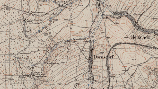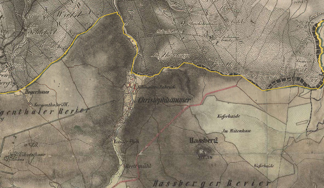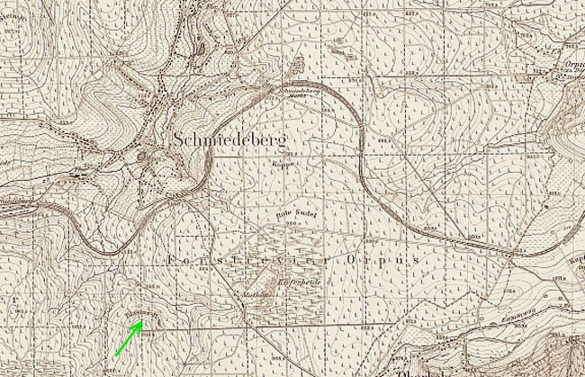 Der Eisenstein wird theils nach Böhmen an die Hohöfen zu Schmiedeberg, Kallich und Gabrielhütte, theils nach Sachsen an die Eigenthümer der Hohöfen zu Schmalzgrube, Sächsisch- Kühnheit, Schlössel, am rothen Hammer, zu Mittel- Schmiedeberg (Werkel) verkauft. Das Stollenneuntel und der Zehnte ist hier, wie zu Orpes, an die Herrschaft Rothenhaus verpachtet.“ (Mit dem „Schlössel“ und dem „Rothen Hammer“ dürften die Hammerwerke bei Hammerunterwiesenthal gemeint sein. Anm. d. Red.)