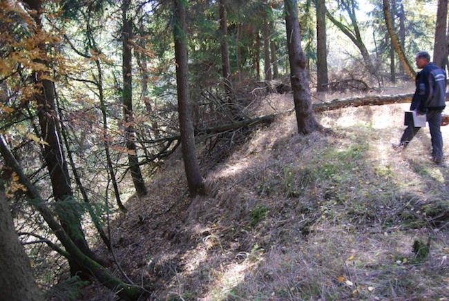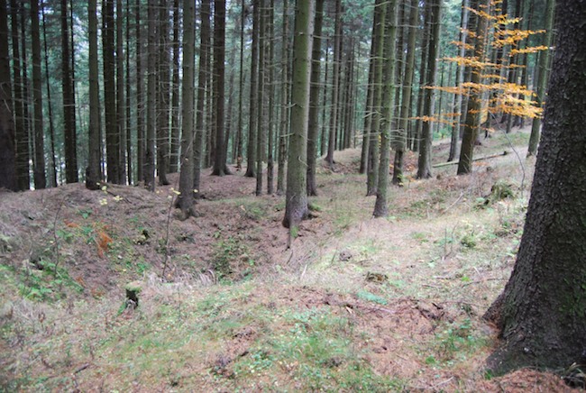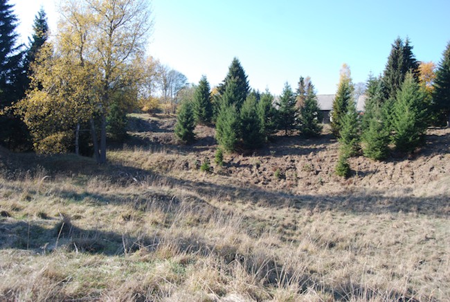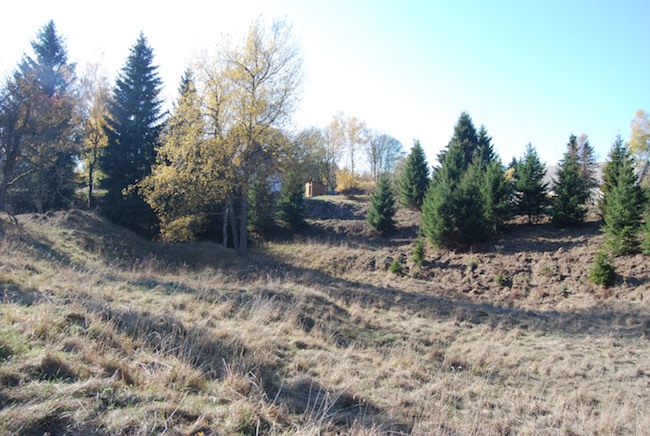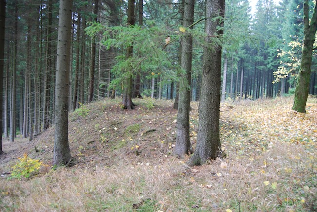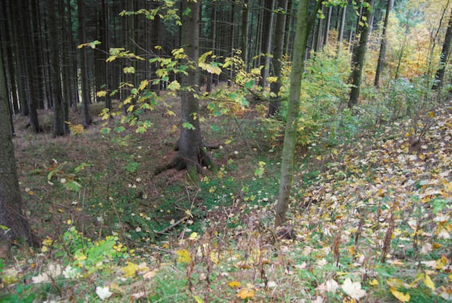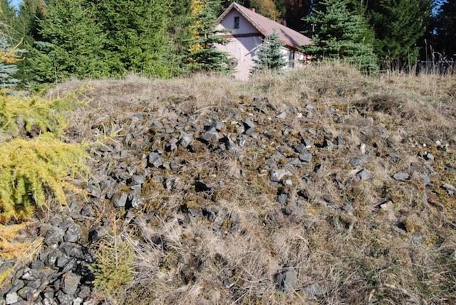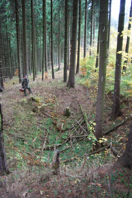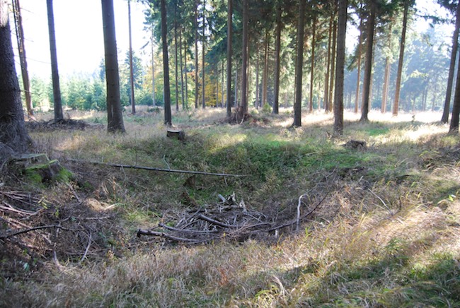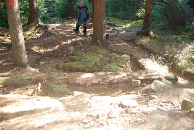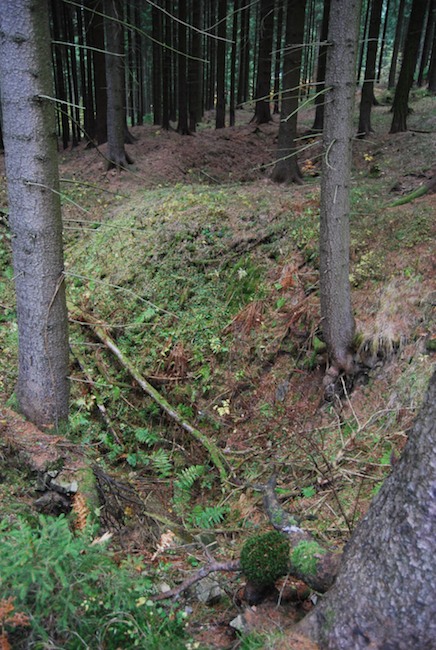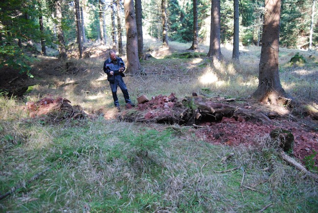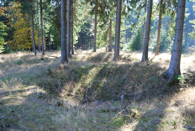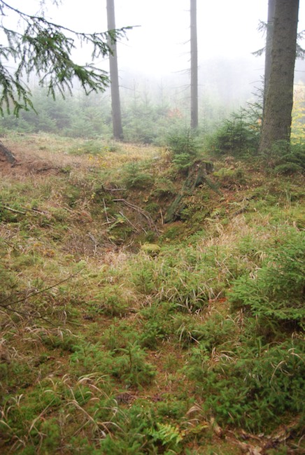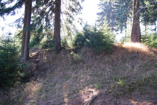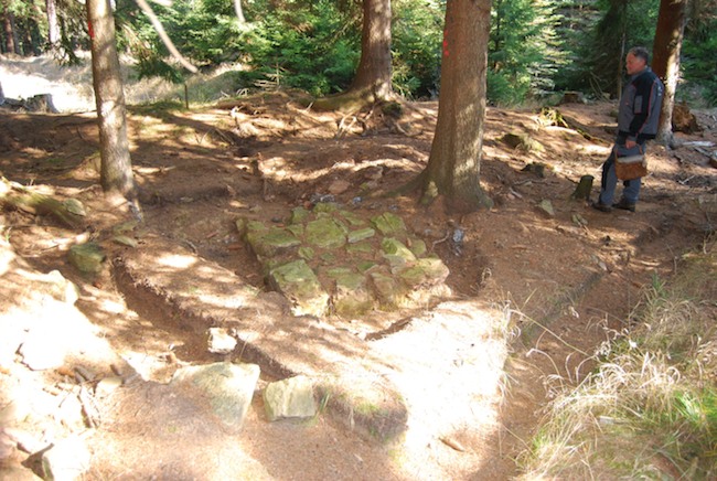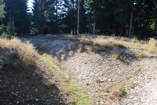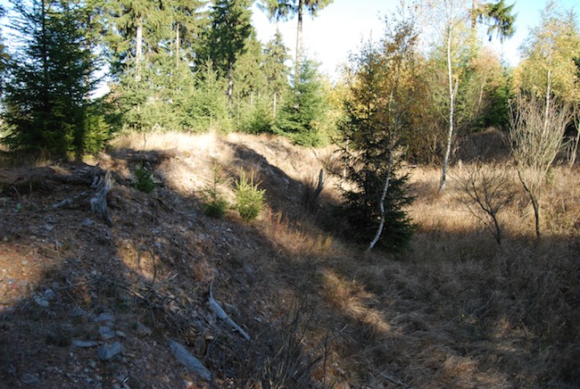 Südliche Ausgrabung Die nachfolgenden Bilder können einer Ausgrabungsnummer zugeordnet werden und sind im Tagungsband „ArchaeoMontan 2014 – Ergebnisse und Perspektiven“ näher beschrieben, und zwar unter „Archäologische Untersuchung – Sondage 1/13“. Der deutsche Text hierzu findet sich ab Seite 160, der originale tschechische Text ab Seite 151. Wir wollen nur sehr kurz darauf eingehen und die wichtigsten Ergebnisse hier schildern. Untersucht wurde ein grabenartiges Geländerelikt von etwa 150 m Länge. Zu diesem Befund gehörte auch eine recht ansehnliche Halde, die wohl nur taubes Gestein enthielt. Der Graben wurde als Tagebaustruktur eingestuft. Aus dem Graben heraus sollen auch kleine Schächte geteuft oder wenigstens Schürfe angelegt worden sein. Ein Fund von Keramik wird als mittelalterlich eingestuft und der Zeit der Existenz der Siedlung auf dem Kremsiger zugeordnet. Die aufgefundene Holzkohle ist mittels C14-Methode in eine noch frühere Epoche datiert worden. Daher geht man von einer späteren Wiederaufnahme der bergbaulichen Tätigkeit aus. Wir haben einige Jahre später diese Ausgrabungsstelle in Augenschein genommen und folgende Bilder für unsere Dokumentation erstellt.