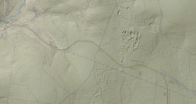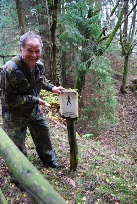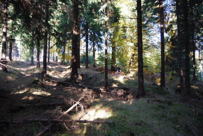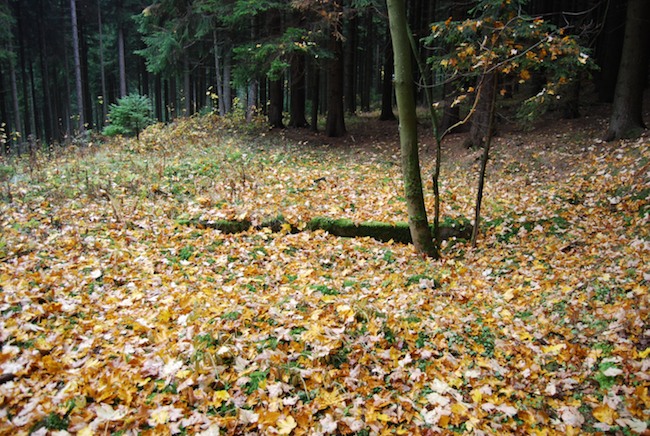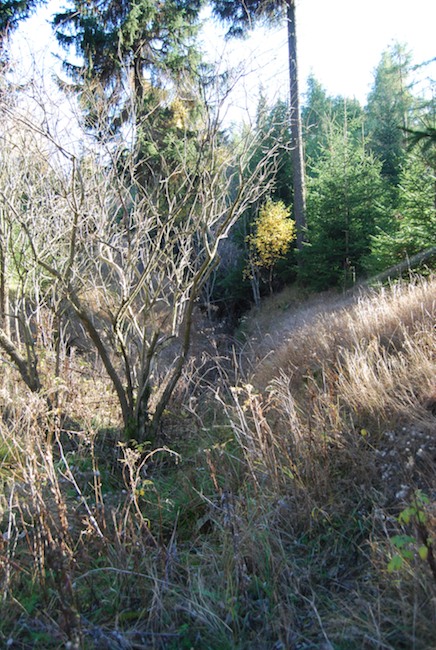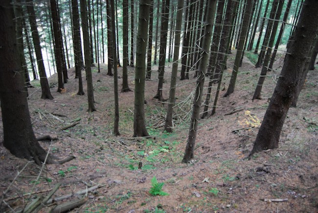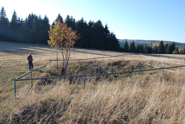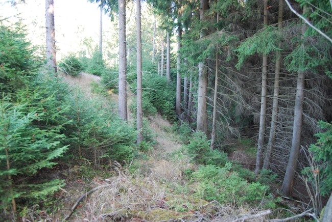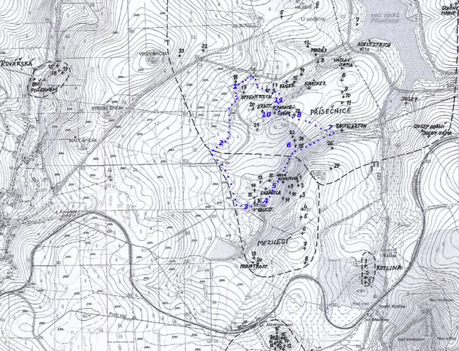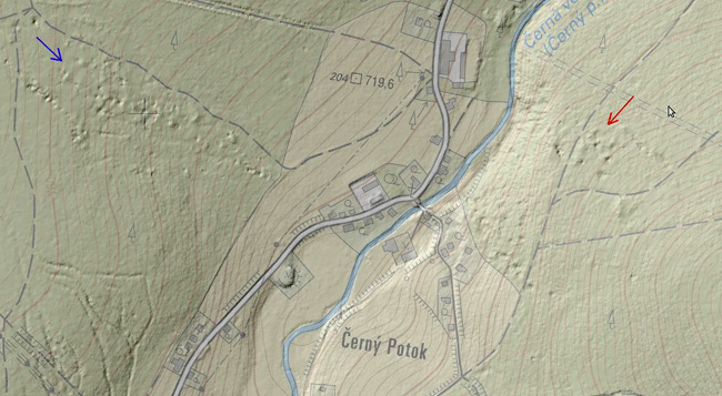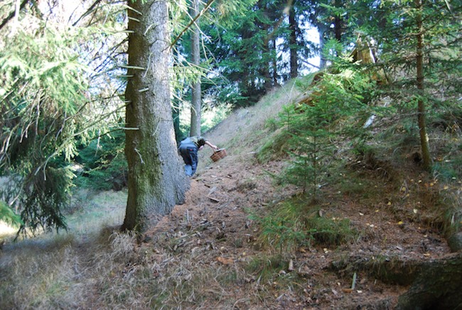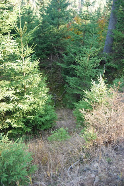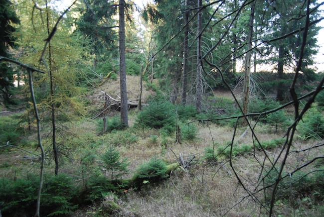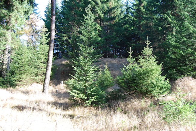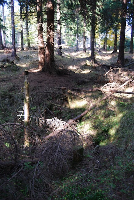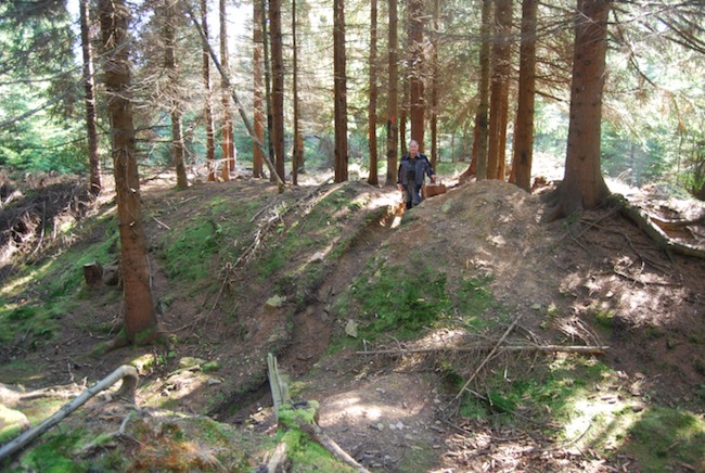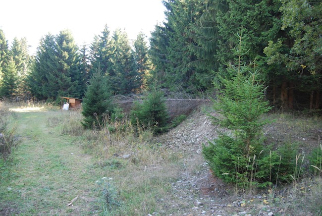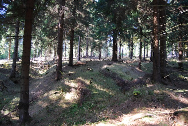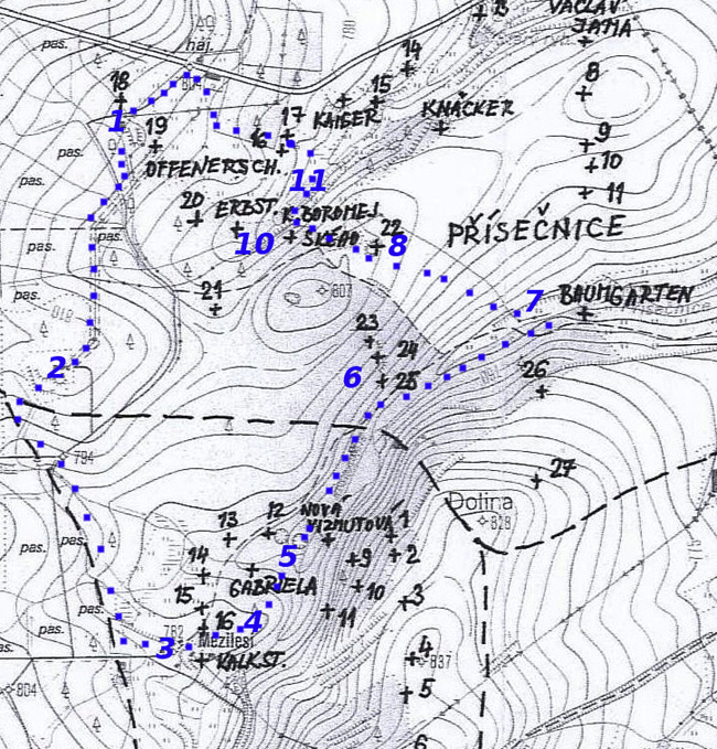 Südliche Ausgrabung Die nachfolgenden Bilder können einer Ausgrabungsnummer zugeordnet werden und sind im Tagungsband „ArchaeoMontan 2014 – Ergebnisse und Perspektiven“ näher beschrieben, und zwar unter „Archäologische Untersuchung – Sondage 1/13“. Der deutsche Text hierzu findet sich ab Seite 160, der originale tschechische Text ab Seite 151. Wir wollen nur sehr kurz darauf eingehen und die wichtigsten Ergebnisse hier schildern. Untersucht wurde ein grabenartiges Geländerelikt von etwa 150 m Länge. Zu diesem Befund gehörte auch eine recht ansehnliche Halde, die wohl nur taubes Gestein enthielt. Der Graben wurde als Tagebaustruktur eingestuft. Aus dem Graben heraus sollen auch kleine Schächte geteuft oder wenigstens Schürfe angelegt worden sein. Ein Fund von Keramik wird als mittelalterlich eingestuft und der Zeit der Existenz der Siedlung auf dem Kremsiger zugeordnet. Die aufgefundene Holzkohle ist mittels C14-Methode in eine noch frühere Epoche datiert worden. Daher geht man von einer späteren Wiederaufnahme der bergbaulichen Tätigkeit aus. Wir haben einige Jahre später diese Ausgrabungsstelle in Augenschein genommen und folgende Bilder für unsere Dokumentation erstellt.