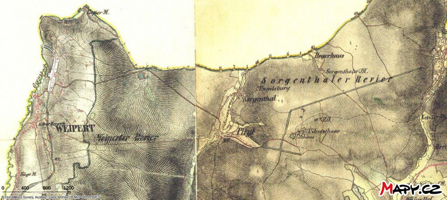 bis 910 m Höhe zwischen Joachimsthal (Jàchymov) und Komotau (Chomutov) gelegen.