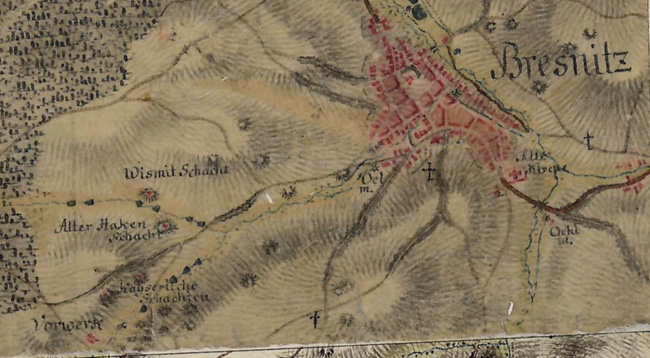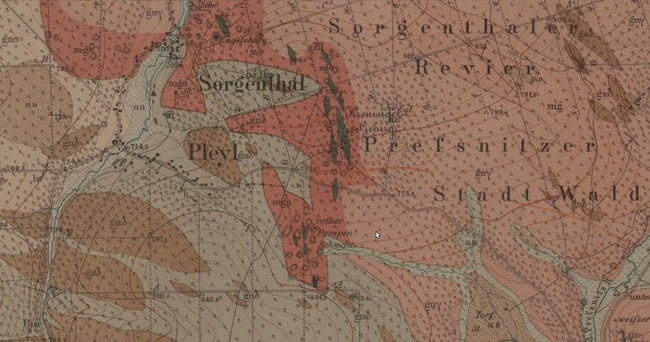 „Rothe Mantel- Zeche, im Ausspanner Gebirg (im Nordwesten von Pressnitz). Auch in dieser Gegend war der Abbau von Eisenerzen einst von nicht geringer Ausdehnung. Die Adalberti- , Rothe Schacht- und Anna- Zeche waren unter den älteren Bauen, die an der linken Seite des Haidbachels umgingen, die wichtigeren, und zum Theil noch vor etwa 10 Jahren in Betrieb. (also in den 1840er Jahren – Anm. d. Red.) Das gewonnene Rotheisenerz war theils metamorphisches, theils solches, das auf Quarz- und Hornsteingängen einbricht, welche zumeist zwischen Stunde 1 und 3 streichen. Uebrigens dürfte hier früher selbst auch Magneteisenerz erzeugt worden sein, wie man denn auch gegenwärtig beim Klösterle-Schacht und im Feldorte der Rothen Mantel- Zeche solche Anbrüche oder doch das für den Magneteisenstein charakteristische Amphibol- und Chloritgestein beleuchtet, wo jedoch bisher noch keine Ausbeuten erzielt wurden, da der ganze Bau, welcher bei letzterer Zeche erst seit 1853 wieder neu in Angriff genommen ward, bisher eigentlich bloss ein Ausrichtungs- und Hoffnungsbau gewesen ist. Den oben genannten, an der linken Seite des Haidbachels befindlichen Klösterle- Schacht hat man 1842 neu belegt, die Zimmerung ausgewechselt, musste aber wegen Grundstreitigkeiten letztere Zeit seinen Weiterbetrieb einstellen. Er hat 18 Klafter Teufe und durchfährt 3 Magneteisensteinlagen. Die oberste darunter, in 9 Klafter Tiefe angefahren, ist 2 Fuss mächtig, darunter folgt Glimmerschiefer auf 1 ½ bis 2 Klafter, dann die zweite Lage von 3 Fuss, wieder Glimmerschiefer zu 6 bis 12 Zoll, und endlich die 3. lagerförmigen Masse von 2 Klafter Mächtigkeit. Ihr Einfallen ist sanft in Südosten gerichtet, woraus sich mit einiger Wahrscheinlichkeit schliessen lässt, dass das bei der Rothen Mantel- Zeche während der Aufnahmezeit am Ortsanstande anbrüchig gewordene, aus Amphibol und Chlorit bestehende Gestein als die Fortsetzung eines jener Magneteisensteinlagen anzusehen wäre.“