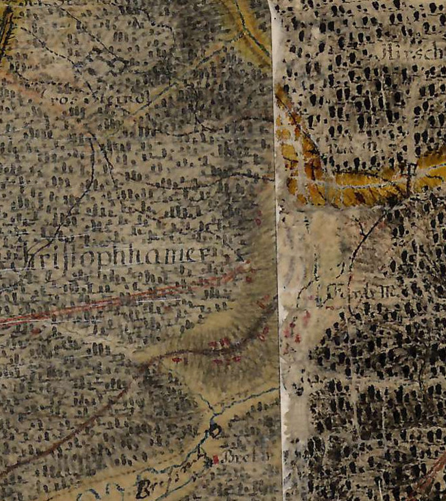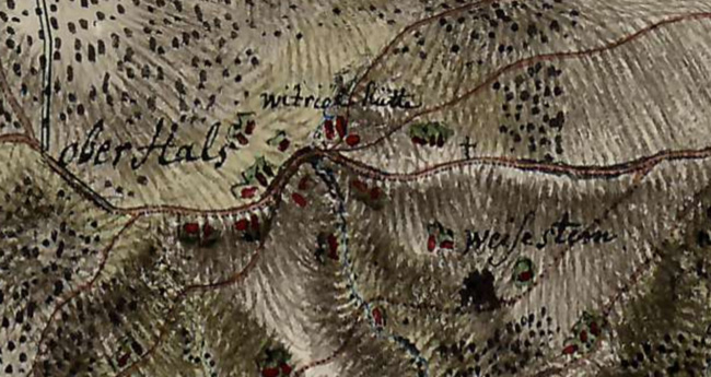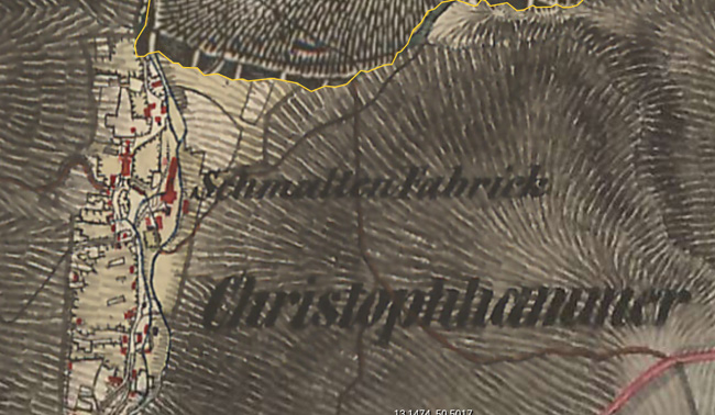 Wie oben zu lesen stand, ging der Name Christophhammer wohl auf den Initiator des Baus im ersten Viertel des 17. Jahrhunderts, Christoph Grad von Grünenberg, zurück; vielleicht auch auf spätere Pächter, bei den der Vorname mehrfach wieder erscheint, wie Christoph Panhans oder im späten 17. Jahrhundert Christoph Häßler. Im folgenden Textausschnitt, der das Werk und seine Produktionsweise beschreibt, hat der Autor dann aber „Sankt Christoph“ zu einem Schutzpatron des Ortes gemacht. So ändert sich die historische Sichtweise. Wir sehen ihm das nach, denn ein wenig himmlischer Beistand ist auf den Kammhöhen des Gebirges gewiß nie schädlich… „Das Blaufarbenwerk zu St. Christophshammer. Obgleich das allgemeine Verfahren bei den Blaufarbenwerken in mehreren Schriften, und erst unlängst in Kapf‘s Beiträgen zur Geschichte des Kobalts, Kobaltbergbaues und der Blaufarbenwerke (Breslau, 1792. 8.), mit Rücksicht auf die in mehreren Ländern wirklich existirenden Blaufarbenwerke sehr vollständig wirklich beschrieben ist, so trifft man doch in jedem Lande, und fast bei jedem Blaufarbenwerke, kleine Unterschiede und besondere Einrichtungen, die ausgezeichnet zu werden verdienen. Um so mehr glaube ich in diesem Werke eine kurze Beschreibung des Blaufarbenwerkes zu St. Christophshammer auf der K. Kameralherrschaft Presnitz liefern zu können, ... Dieses Blaufarbenwerk hat der jetzige Besitzer, Herr Schlemm, von der K. Staatsgüter- Administration im J. 1789 käuflich an sich gebracht. Der Kobalt, als das Haupterforderniss zur Bereitung der blauen Farbe, wird von dem Eigenthümer grösstentheils von Joachimsthal aus den dasigen Gruben, worunter die Einigkeit die vorzüglichste ist, deren Bau auf drei Hauptgängen, welche sich durchkreuzen und auf ihren Schaarpunkten vorzüglich ergiebig sind, betrieben wird, bezogen. Die Ausbeute des Kobaltes von diesen Gruben wird unter die erzgebirgischen Blaufarbenwerke vertheilt, und Herr Schlemm erhält zu seinem Antheile ein Achttheil. führt eine von der weiland K. u. K. Maria Theresia errichtete Taxe an, welche den Preis aller in Böhmen geförderten Kobalte von 20 bis 48 Livres, 15 Sols (von 5 Thlr. 10 Ggr. bis auf 13 Thlr. 9 ½ Ggr.) für den Zentner bestimmt. Jetzt kömmt der Zentner Kobalt (mit anstehender Bergart, so wie er von der Grube kömmt), auf 10 ⅔ bis 15 ⅔ Thaler, der reinste und beste Kobalt aber auf 44 ⅔ Thaler zu stehen, und die Fracht bis an das Farbenwerk zu St. Christophshammer erhöhet seinen Preis bis auf 60 Thaler, da doch in Sachsen der Zentner des schönsten Kobaltes nur 18 Thlr. kosten soll. Nebst diesem böhmischen Kobalte, wird hier noch etwas sächsischer, und selbst ein kleiner Theil spanischen Kobaltes verarbeitet. Das zweite Bedürfniss zu einem Blaufarbenwerke ist der Quarzsand. Diesen bereitet man hier aus den grossen Quarzblöcken, die an dem östlichen Abhange des Orpeser und Kremsger Gebirgszuges, der sich, von dem Kupferhügel sanft abfallend, bis an die sächsische Gränze hinabzieht, zerstreuet liegen, und Ueberbleibsel mehr und minder mächtiger, in dem Gneisse einbrechender Quarzlager sind. Der dem Blaufarbengemenge beigemengte Fluss ist hier die Potasche, welche sowohl in den böhmischen Potaschsiedereien aufgekauft, als auch aus Ungarn bezogen wird. Der Preis derselben ist seit einigen Jahren ansehnlich gestiegen (von 8 Thaler bis 15 Thaler und mehr). Wegen dieses erhöheten Preises ist von den sämmtlichen Blaufarbenwerken des Erzgebirges um ein Verboth der Ausfuhr inländischer Potasche bei der Landesstelle angesucht worden. Das Holz findet sich ganz in der Nähe, da sich von beiden Gebirgsabhängen, welche das Thal, in welchen das Dorf Christophshammer liegt, einschliessen, die Waldungen bis an den Bach herabziehen. Der zu dem Blaufarbenwerke jährliche Holzbedarf soll in 1.400 Klaftern bestehen. Man nimmt zum Gehrauch immer weiches Holz (hier Fichten- und Tannenholz) theils wegen des niedrigern Preises, theils weil es mehr Flamme giebt, und so das Rösten und Schmelzen befördert. Der Preis einer Niederöstreich. Klafter 5/4 elligen Holzes ist im Walde 1 Fl. 40 Kr. (1 Thlr. 2 ½ Gr.), des 7/4 elligen 2 Fl. 20 Kr. (1 Thlr. 13 Gr.). Das zu dem Blaufarbenwerke benöthigte Wasser ist ziemlich rein, frei von allem Extractivstoffe und mineralischen Theilen, und auf die Reinheit des Wassers, vom welcher zum Theil die Schönheit der Farbe mit abhängt, kömmt vieles an.“