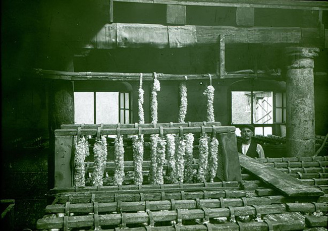 wird es auf, über Stäbe gelegte Hunden ausgebreitet. Nach dem Trocknen wird die