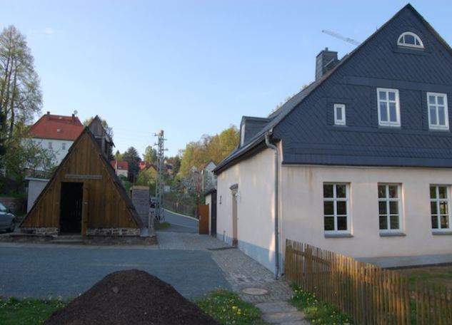 Zufahrt zum Schachthof. Links das Huthaus, rechts die Schachtkaue über dem