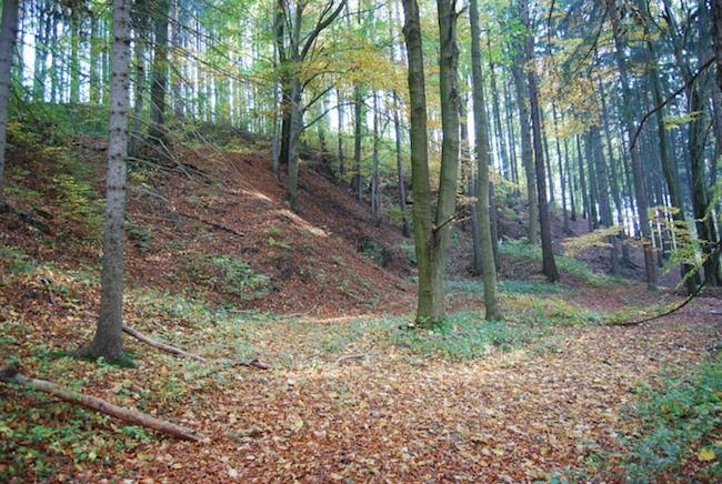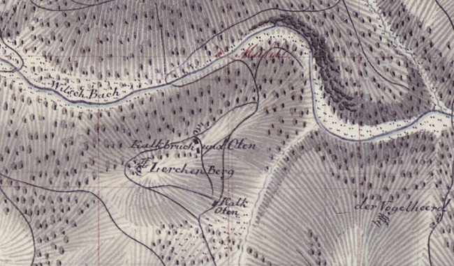 Auch hier findet man an den Ausstrichen der Kalklager große Schrammen im Gelände, welche noch immer die alten Tagebaue aus der Anfangszeit markieren.