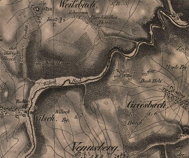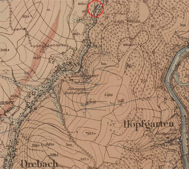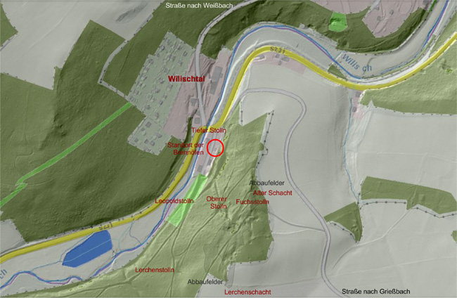 ![]() Mit Unterstützung der ortskundigen Heimatfreunde konnten wir 2019 aber zumindest das Mundloch des tiefen Stollens noch wiederfinden: Es liegt etwas versteckt hinter dem ehemaligen Aufschlagwassergraben der früheren Sägemühle und nur wenige Meter oberhalb der Wilisch.