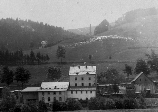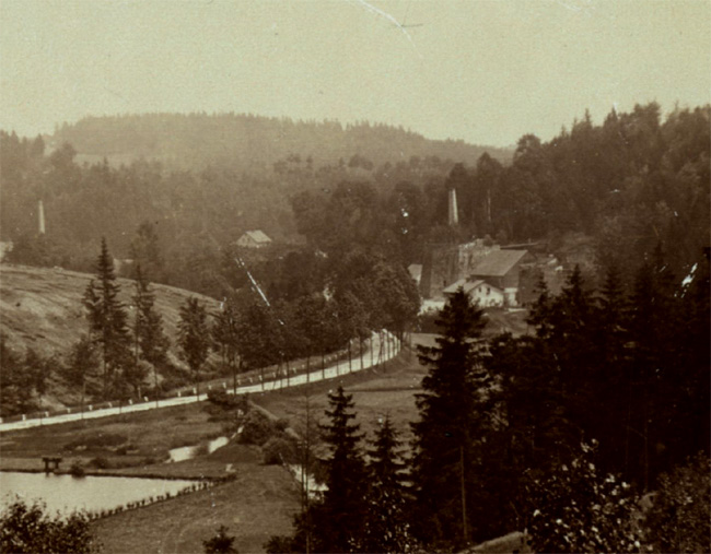 ![]() Etwas vergrößerter Ausschnitt aus obigem Foto. Leider verdeckt das Gelände die Anlagen des Kalkwerkes, der Südhang des Seitentales wird nur noch von dem 1914 umgelegten Schornstein der Dampfkesselanlagen am Kalkwerk überragt.