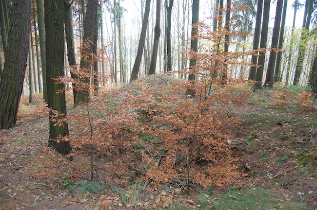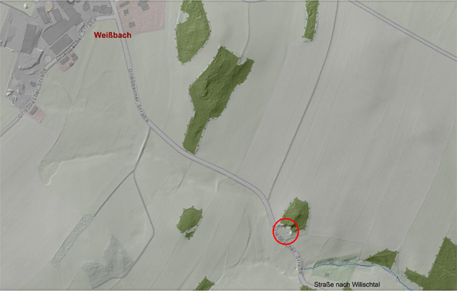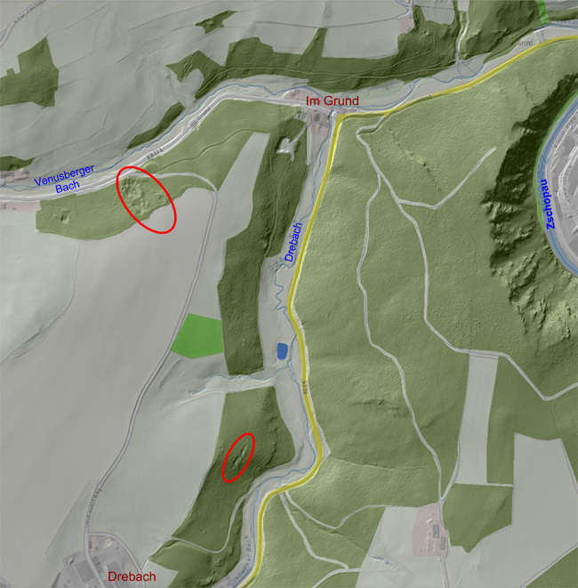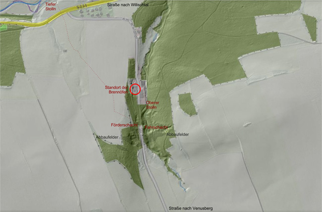 ![]() Anhand der Geländekante etwas links im Bild ist sogar der Verlauf der Eisenbahn vom Schacht zu den Kalköfen noch zu sehen.