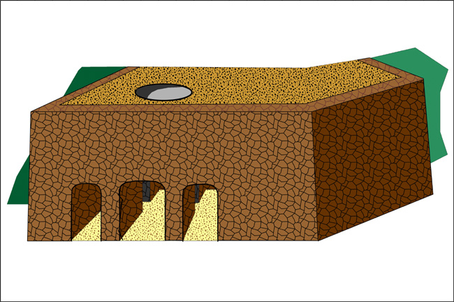 ![]() Wir skizzieren uns das, was wir hier gesehen haben, wieder auf, weil dieser Ofen doch etwas anders aussieht, als ein „gewöhnlicher“ Schneller- Ofen. Vielleicht fehlte im engen Tal einfach der Platz, um den Ofen weiter vor den Talhang rücken zu können, so daß er keine seitlichen Zugänge bekam und stattdessen alle drei Zugänge an seiner Frontseite liegen.