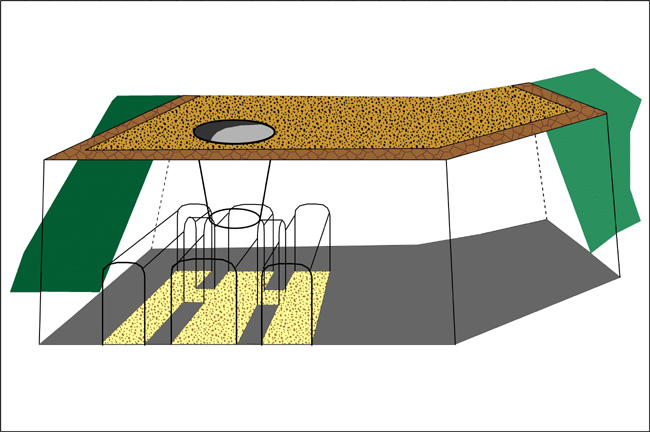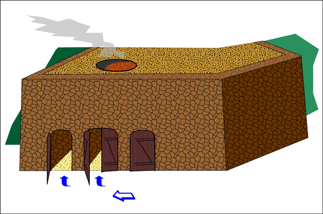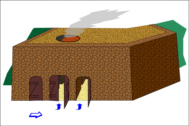 ![]() Mit Hilfe von Torflügeln hätte man auch bei dieser Bauart die Talwinde recht einfach „abzweigen“ und zur Verstärkung des Zugs im Ofenschacht nutzen können...