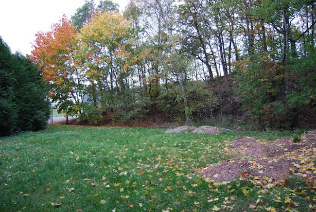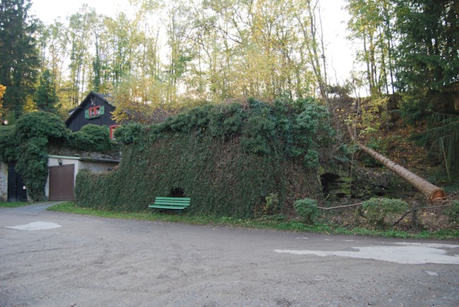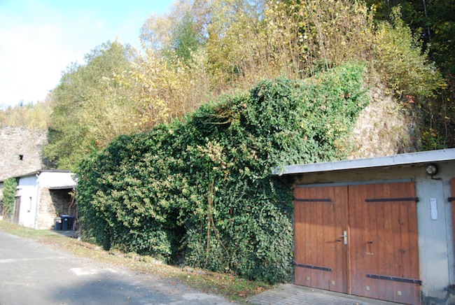 ![]() Erst beim näheren Hinschauen erkennt man unter dem grünen Bewuchs die Reste des angebauten Zylinderofens. Ob links davon die Garage der Rest des Kalkofenhauses gewesen ist, wissen wir nicht. Mittlerweile haben die Besitzer sich die Parzellen nach ihren heutigen Bedürfnissen und Ansichten umgestaltet.