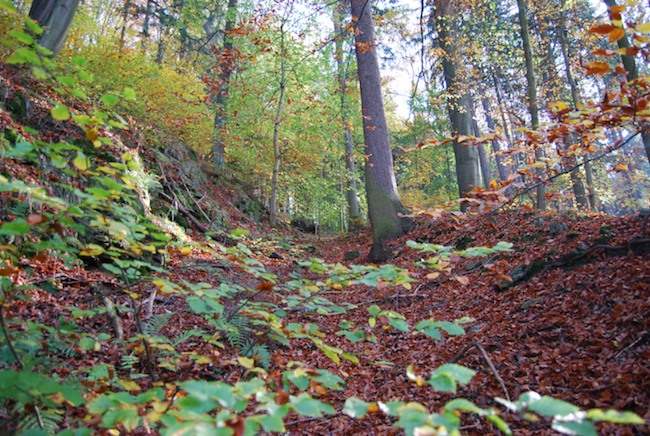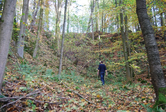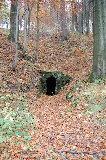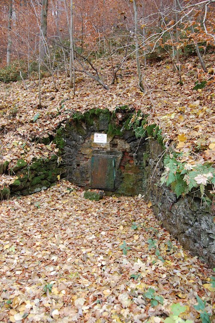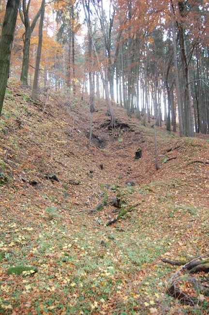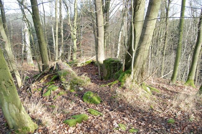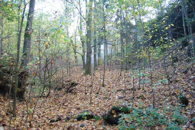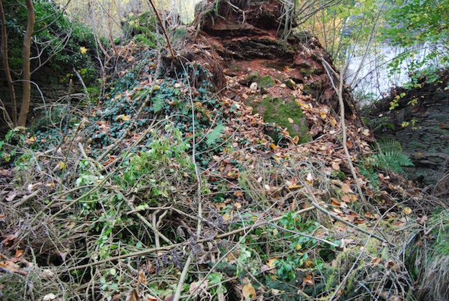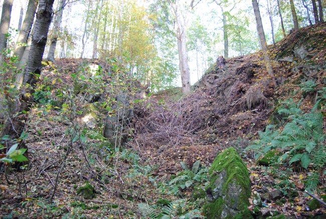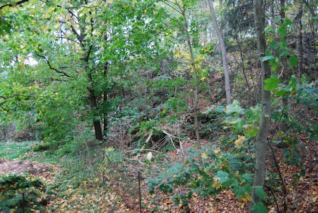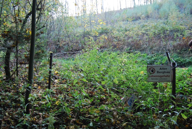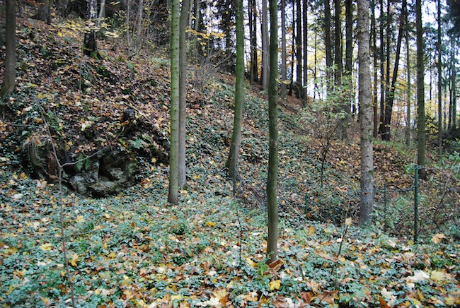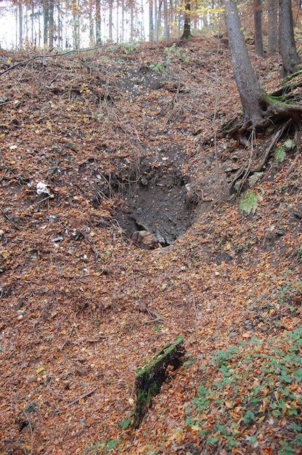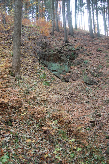 ![]() Auf dem Weg zum Kalkwerk Venusberg entlang des ausgeschilderten Wanderwegs finden sich auch noch einige Spuren des früheren Kalkbergbaus. So wie hier dieser Einschnitt, der das verbrochenen Mundloch eines Stollns markieren könnte.