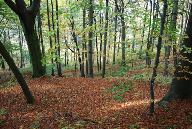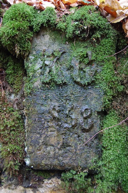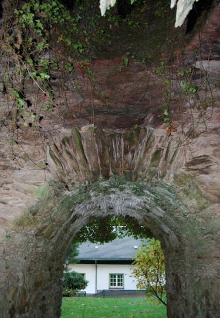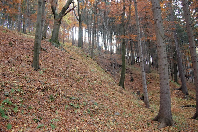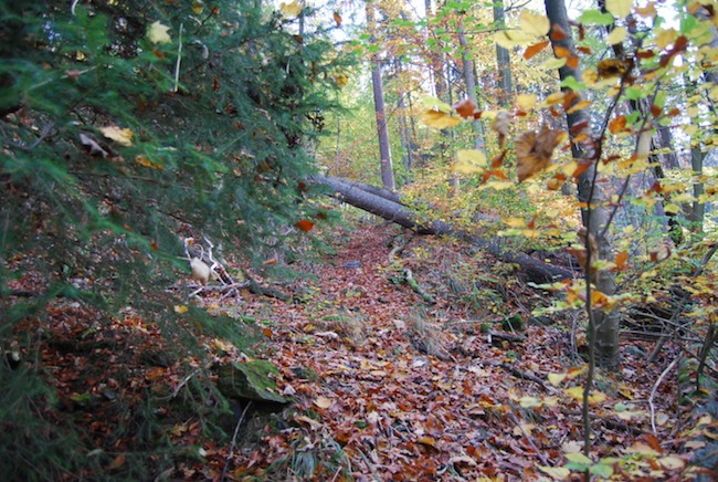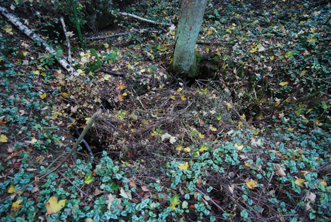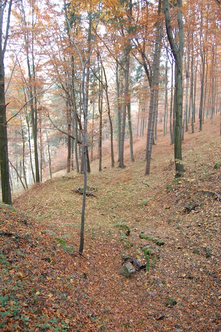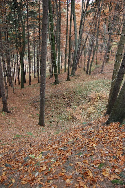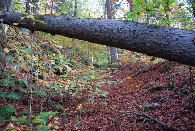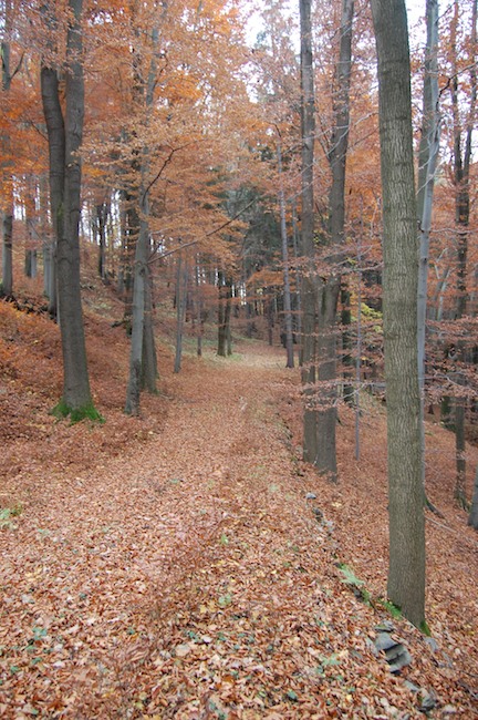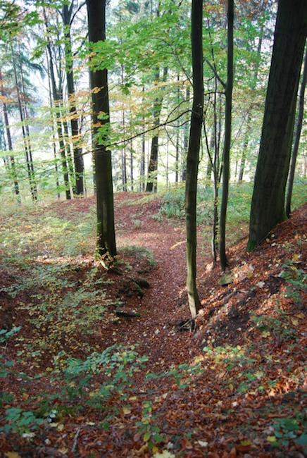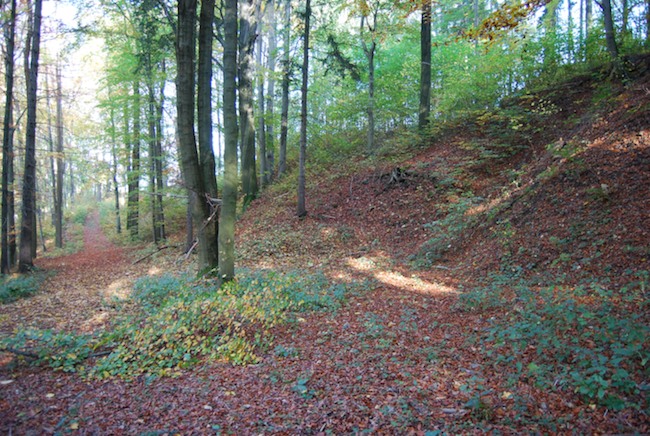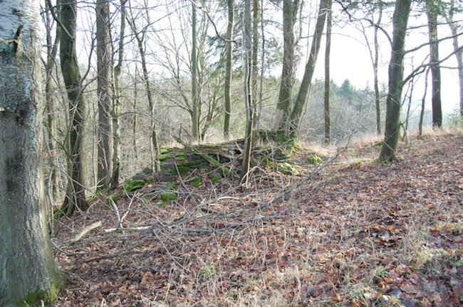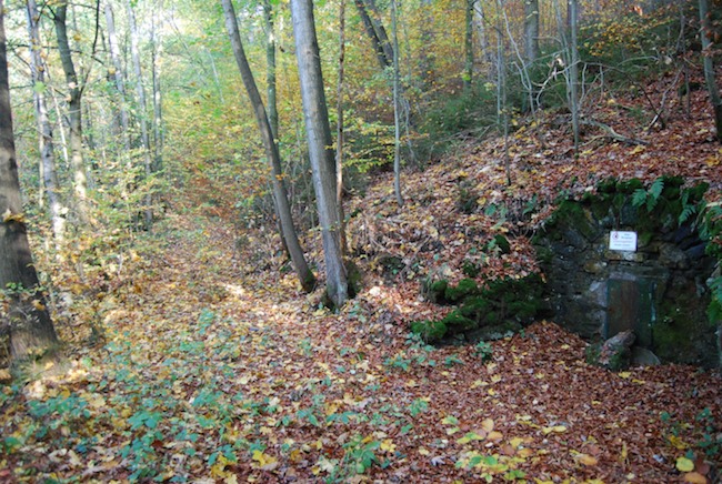 ![]() Auf dem Weg zum Kalkwerk Venusberg entlang des ausgeschilderten Wanderwegs finden sich auch noch einige Spuren des früheren Kalkbergbaus. So wie hier dieser Einschnitt, der das verbrochenen Mundloch eines Stollns markieren könnte.