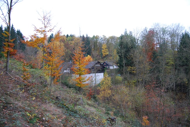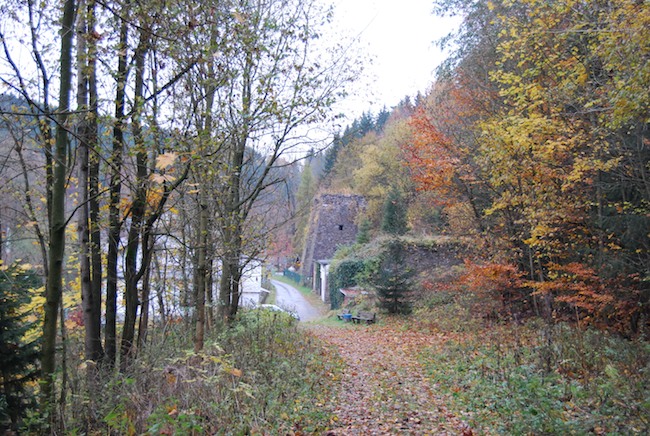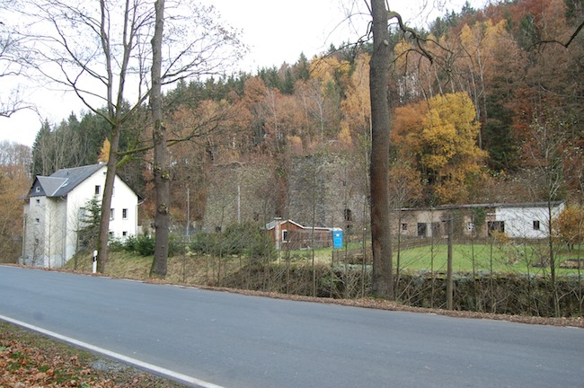![]() Blickt man die kleine Zufahrtsstraße zur Gaststätte „Waldhof“ hinauf, kommt einem kaum mehr in den Sinn, daß hier einst ein qualmendes Kalkwerk stand. |