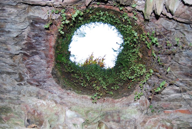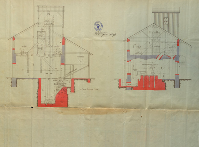 ![]() Das fehlende Gewölbe des Brennkessels ermöglicht einen Blick von unten in den äußerst gut erhaltenen Brennkesselschacht.