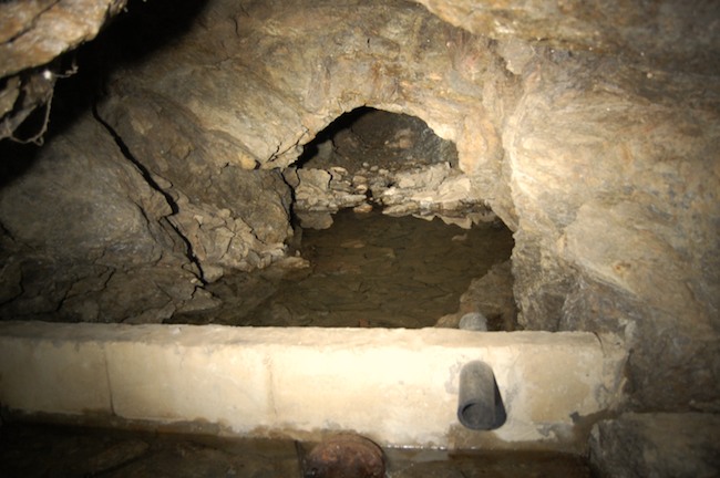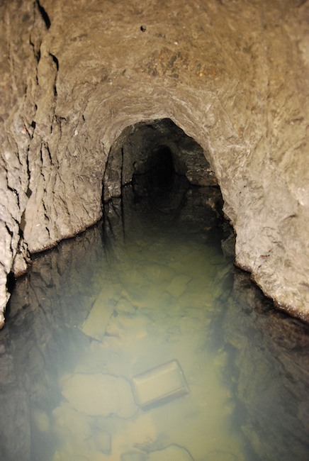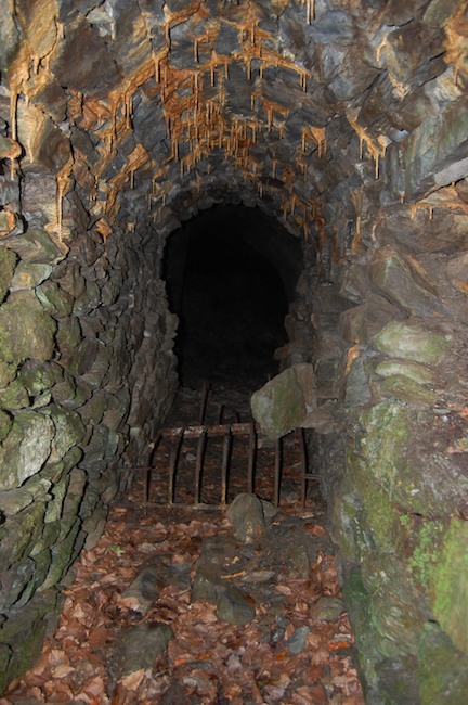 ![]() Ein Blick durch die offene Tür in den Stolln zeigt uns schnell den aktuellen Zustand. Das Mundloch steht erstaunlicherweise noch immer ohne jeglichen Ausbau und ist bis heute nicht verbrochen. Der Damm im Vordergrund trägt die Inschrift: 16.07.1980 und diente wohl als Schlammfang für die Wasserfassung. Im Hintergrund sind dann die Massen des anschließenden, gänzlich verbrochenen Stollntraktes sichtbar.