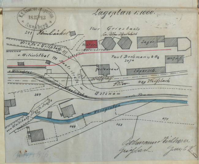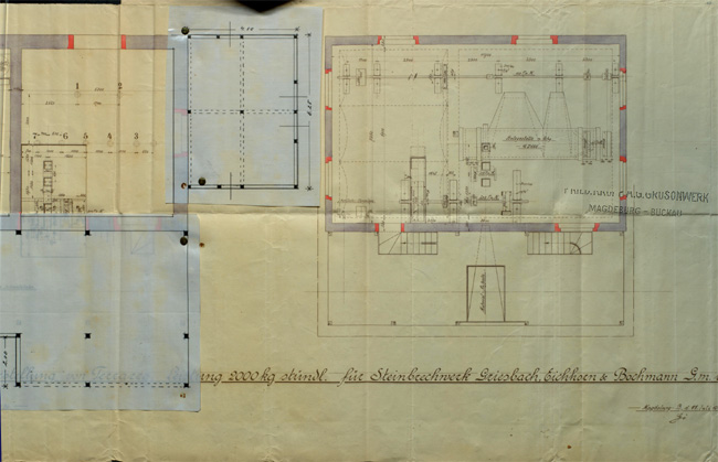 Aus dem Protokoll des Königlichen Bergamtes zu Freiberg vom Januar 1910 geht ebenfalls hervor, daß der noch anstehende Kalkstein nach allen Seiten auskeile und einem absehbaren Ende zu gehe. Nur in der Tiefe können man noch Vorräte erwarten. Der Turbinenschacht müßte dazu um 10 m weiter geteuft werden und dann über Querschläge das Lager wieder aufgesucht werden. Da die Kalkvorräte übertage sehr gering sind, komme auch das Kalksteinbrennen demnächst zum Stillstand. Das Projekt einer Tiefersetzung der Turbine würde somit auch das Kalkbrennen bald zum Erliegen bringen, „was gerade zur Zeit des sonst besten Geschäftsganges einen völligen Ruin des Werkes zur Folge haben würde.“ Bevor Besitzer Bochmann (hier noch immer Gustav Robert Bochmann) den Betrieb des Werkes gänzlich einstelle, wolle dieser aber noch ein Fallort im flach einfallenden Liegenden des Kalksteinlagers vortreiben lassen. Jedoch wären hier größere Wasserzuflüße zu erwarten und es sei fraglich, ob diese bewältigt werden können (40024-12, Nr. 413). Aus einem Protokoll des Königlichen Bergamtes vom April 1910 ist dann ersichtlich, daß das Fallort zur Aufsuchung weiteren Kalksteins tatsächlich in Angriff genommen worden ist. Das Fallort war 3 m breit und bereits auf 3 m Teufe angekommen. Das zusitzende Wasser war noch gering und wurde mit einer Handpumpe bewältigt. Die Massen werden in einer Holzkiste auf einem Schleifbrett von Hand hochgezogen. In nächster Zeit solle aber eine Haspel aufgebaut werden. In einem weiteren Amtsprotokoll vom Oktober 1910 ist dann vermerkt, daß im Fallort guter weißer Kalkstein anstehe und auch abgebaut werde. Das Fallort hatte jetzt 5 m Teufe erreicht. Der Kalkstein wird in Kübeln über ein Globenrad (Umlenkrolle – Anm. d. Red.) mittels Seil aus dem Fallort gezogen. Für die Auffahrung des Fallortes wurde als Sprengstoff neben Dynamit auch Astralit eingesetzt (40024-12, Nr. 413). (Astralite: Bergbausprengstoffe; Zusammensetzung: 68-85% Ammoniumnitrat und 7-27% TNT und DNT sowie weitere Zuschlagstoffe – Anm. d. Red.) Über beide Projekte findet man auch in der betreffenden Jahrbuchausgabe von 1910 Notizen, wieder im Kapitel