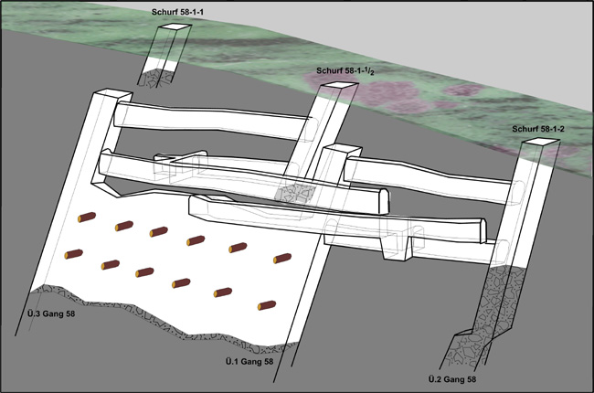 Der erste neue Untersuchungsschacht folgte dem früheren Tiefschurf 58-1-1 nach unten, fand ihn aber vollständig von Bruchmassen ausgefüllt und nicht durchschlägig auf das Überhauen Ü.3, das ihm von der Stollnsohle aus nach oben eigentlich entgegen aufgefahren wurde, vor.