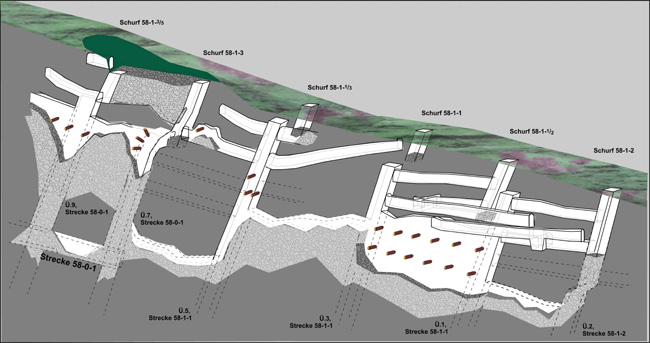 Der Bereich des Gangzuges 58 umfaßte ebenfalls zahlreiche Tagesbrüche unterschiedlicher Dimension. Der Durchmesser der ‒ häufig im Streichen des Ganges elliptisch gestreckten oder entlang durchgebrochener Abbaue gänzlich unregelmäßig geformten ‒ Tagesbrüche schwankte zwischen 4 m und 20 m, die Tiefe lag zwischen 1 m und über 10 m. Zwischen den Tagesbrüchen bestanden Haldenreste und Schurfgräben, wodurch das Oberflächenrelief stark wellig ausgebildet war.