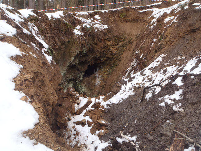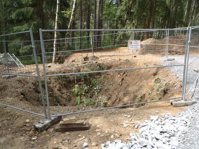 Mit Vielem hätte man vielleicht rechnen müssen ‒ das aber konnte niemand ahnen. Zwar geht aus den Unterlagen der Schachtverwaltung 257 hervor, daß man gelegentlich auch ohne Versatz gearbeitet und ganze Abbaublöcke abgezogen habe, doch gab es nie einen ähnlichen Fall bei der Erkundung und Sanierung am Gang 57. Dieser Abbaublock lag zwischen den Überhaun Ü.1 und Ü.3 auf dem Gang 58, war etwa 30 m lang und von der Stollnsohle bis hierher rund 45 m hoch. Die Breite kann man im Mittel vielleicht auf 2 m schätzen; das „leere“ Volumen dieses Blockes, das hier wie eine Zeitbombe in etwa 10 m Tiefe unter dem Waldboden schlief, kann sich jeder selber schnell mal ausrechnen. Der erste Satz des Projektleiters der Wismut GmbH bei dieser Befahrung und an diesem Punkt war übrigens: „Da geht aber viel rein.“ Ja ‒ wohl wahr und jetzt gab es nicht nur einen Nachtrag, jetzt dauerte es auch länger und jetzt wurde es auch teurer; nicht nur der Materialkosten für die Verfüllbaustoffe wegen ‒ der Baustoff muß ja auch hier ´rein und das ist mit Schaufel und Eimer natürlich nicht zu machen. Und alle, die diese Fotos jetzt sehen, verstehen vielleicht, warum dieser Job getan und die Hinterlassenschaften unserer Vorväter aufgeräumt werden müssen... |