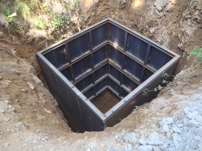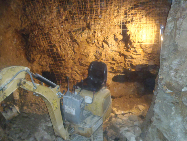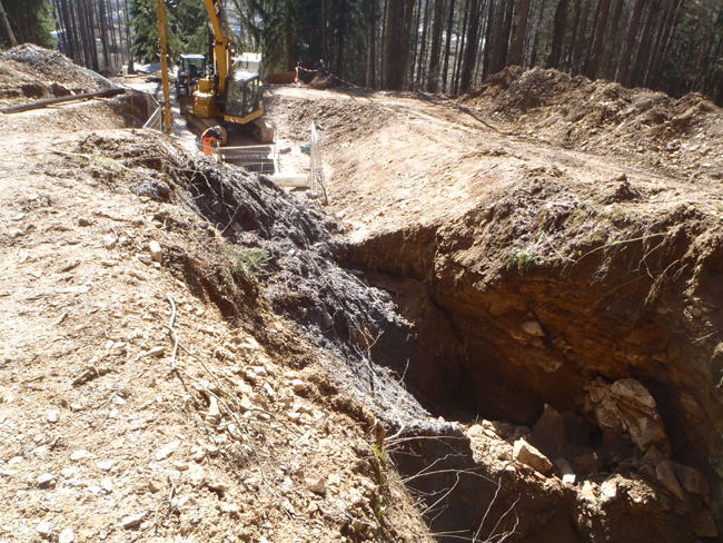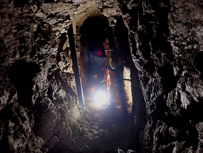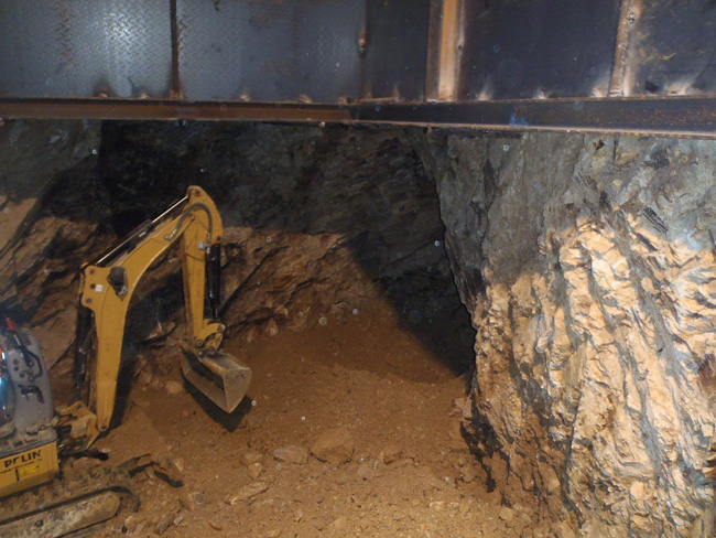 Wieder ein Stück weiter im Streichen: Der bis übertage durchgehauene Abbaublock ist schon mit Beton aufgefüllt und stabilisiert. Nun geht es in gleicher Weise an den letzten der Tiefschürfe.