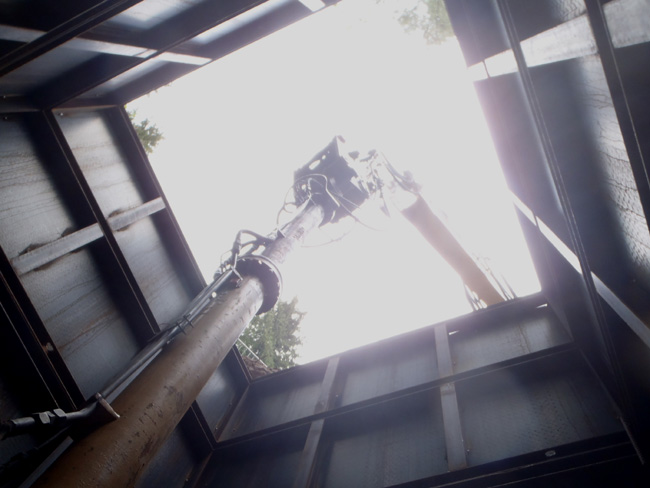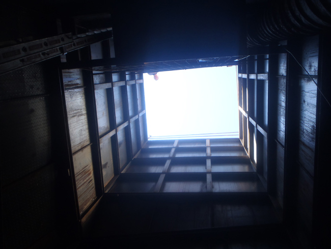 Noch ein Rückblick von unten auf die obere Hilfsbühne. Er macht uns die Dimensionen dieser Hohlräume noch einmal besser anschaulich.