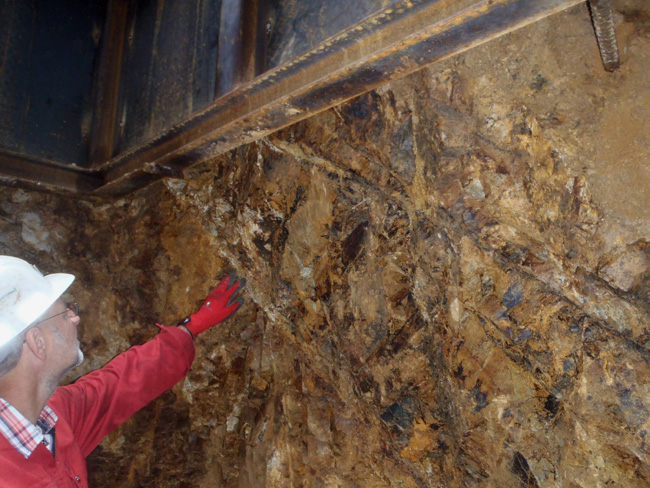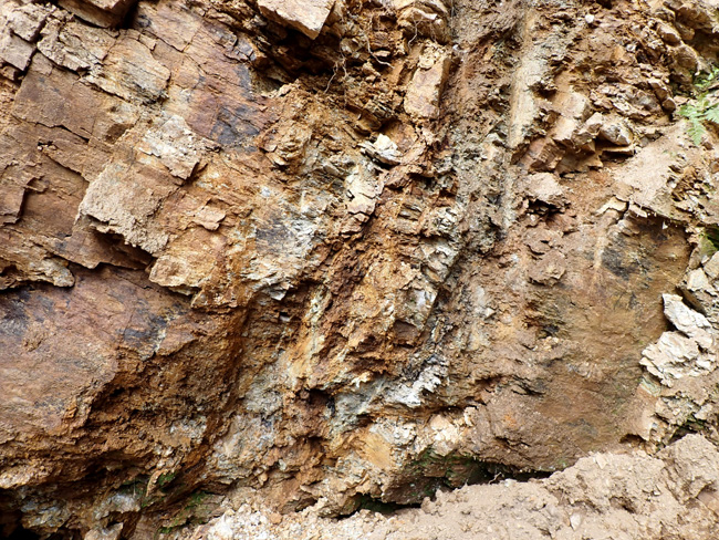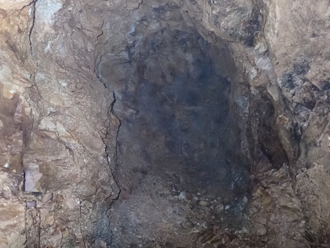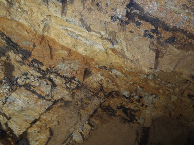 Die Störungszone im Streckenstoß, der die Vorfahren hier gefolgt sind. Ein bißchen Braunstein und Brauneisen - mehr sieht man äußerlich nicht. |