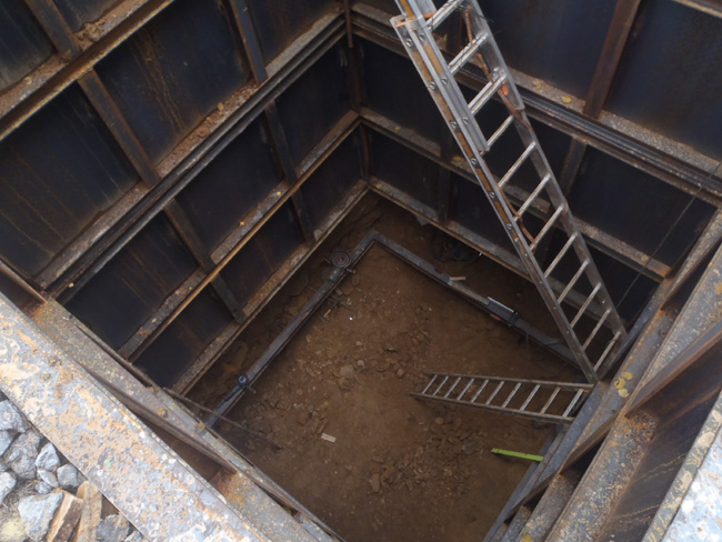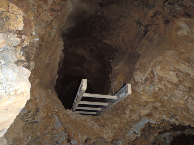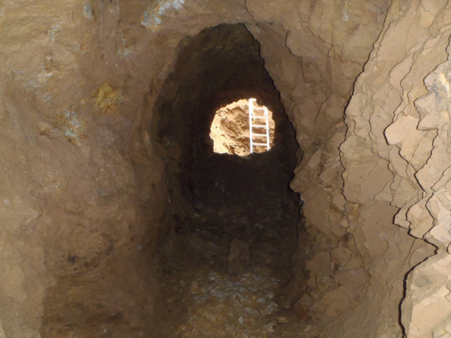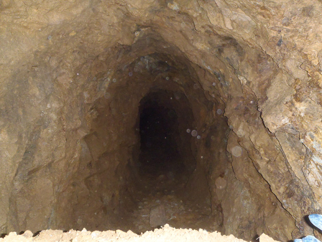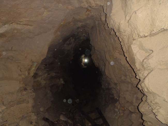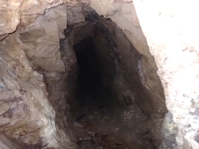 Wir sind hier inzwischen auf etwa 15 m Teufe. Eigentlich hätte schon bei 8 m die oberste Etagenstrecke nach Südosten auftauchen müssen... Die war aber nicht zu finden.