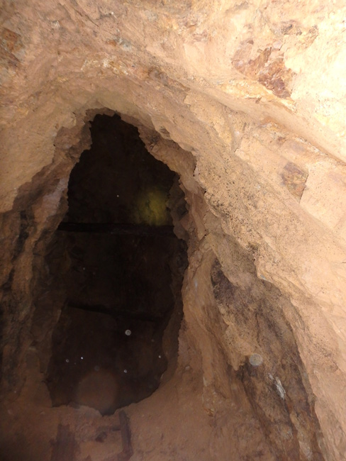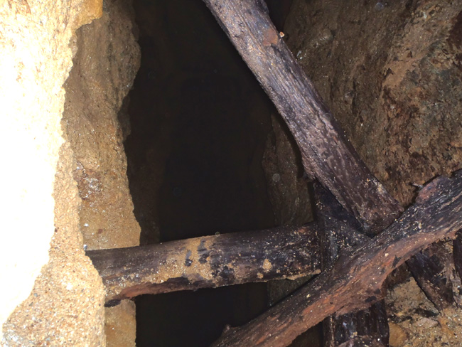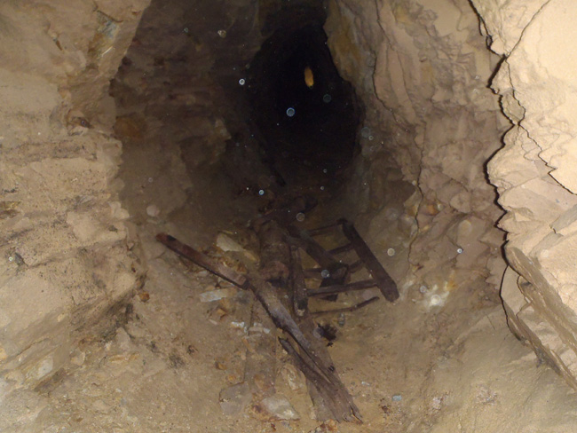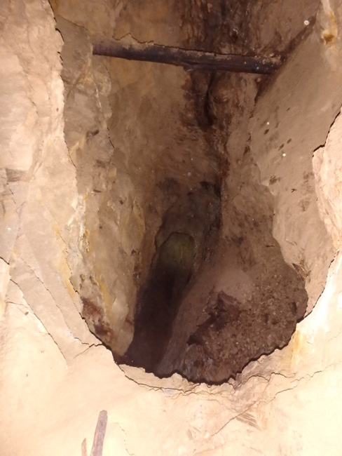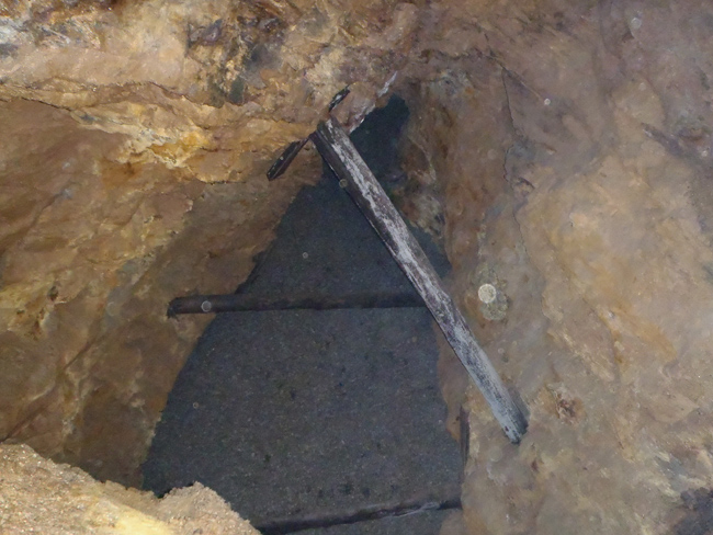 ...und nach unten: Ein endlos wirkendes, finsteres "Loch". Die Stempel im Vordergrund fangen leider die Leistung des Blitzlichts weg... Bis zur Stollnsohle geht es von hier aus noch etwa 35 m weiter in die Tiefe.