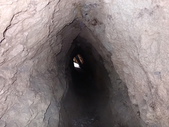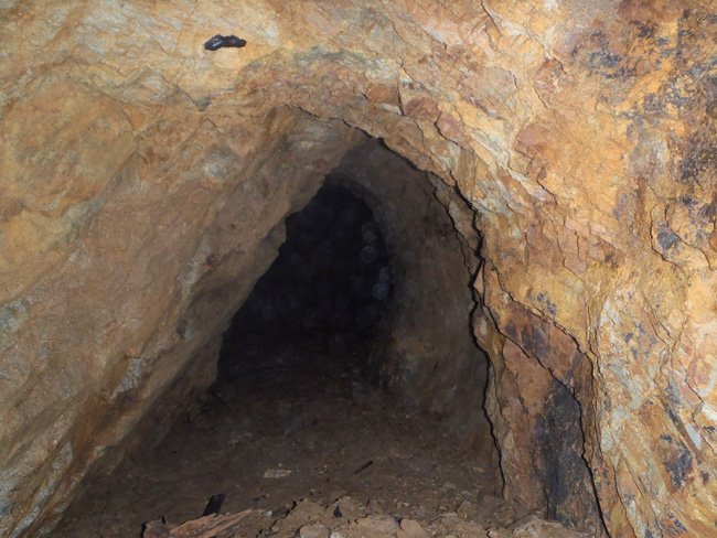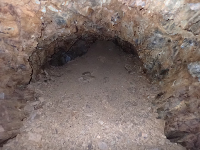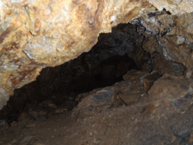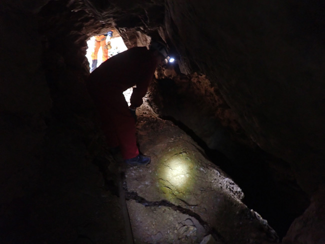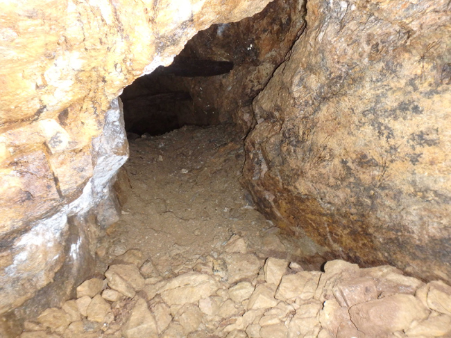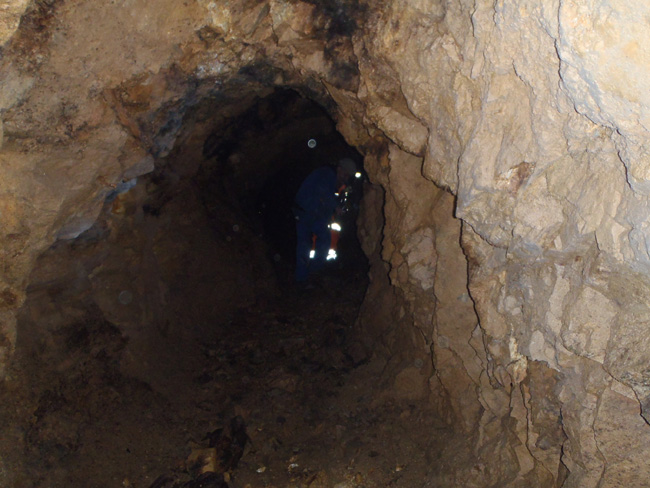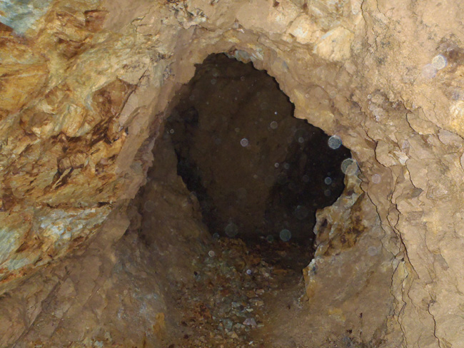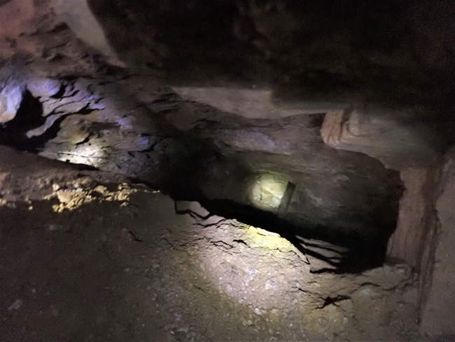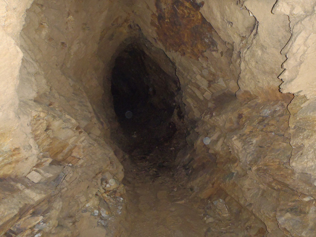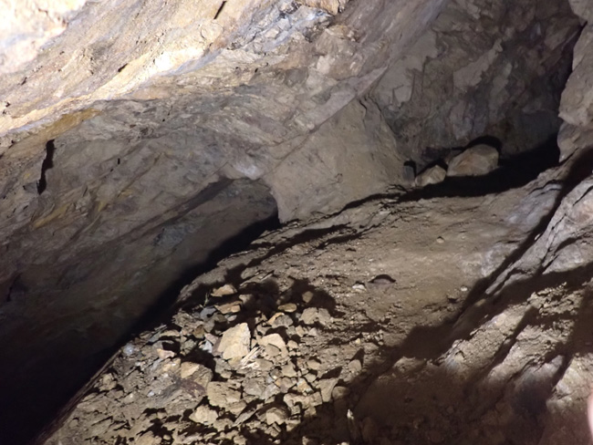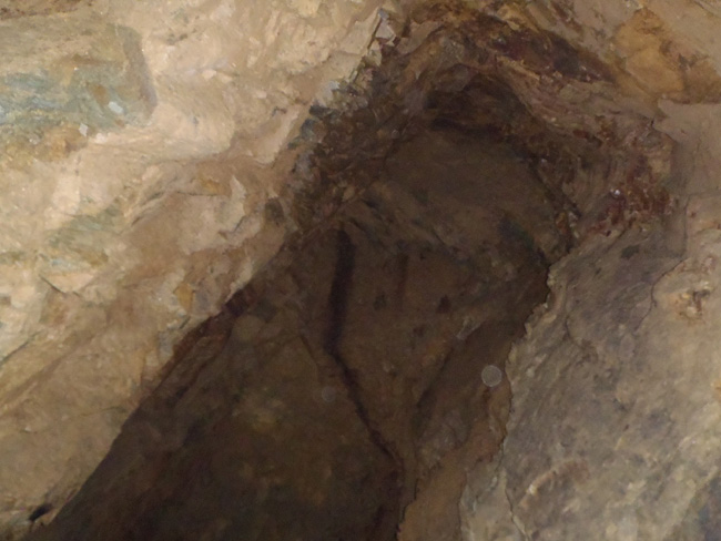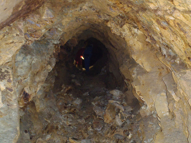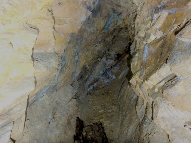 Mit mehr Licht: Rechts geht die letzte Etagenstrecke, die wohl noch die Männer des Objekts 23 oder des Objekts 12 von den übertage angesetzten Erkundungsschürfen aus aufgefahren haben, nach Nordwesten. Sie hat aber eine feste Firste über sich, der bis übertage durchgebaute Block ist folglich von übertage nieder abgebaut worden. Etwa in der Bildmitte sieht man einen nur noch ziemlich dünnen Pfeiler und links unten...