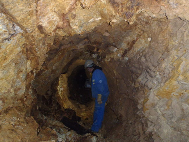 Weißblaue Ausblühungen machen hier im Streckenstoß ein kleines Trümchen mit sich an der Luft zersetzendem Arsenkies sichtbar.