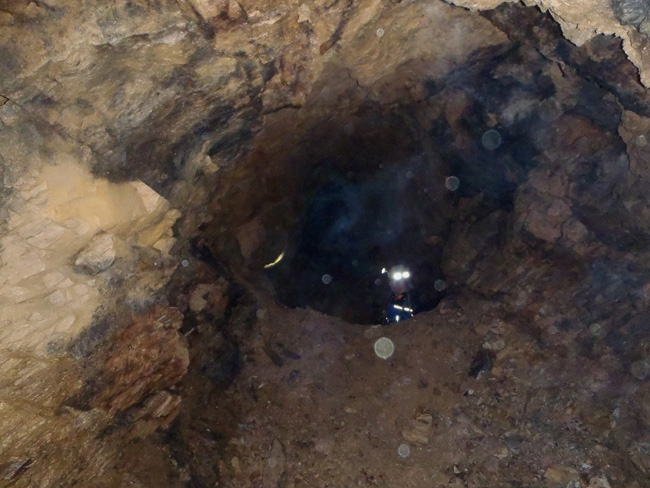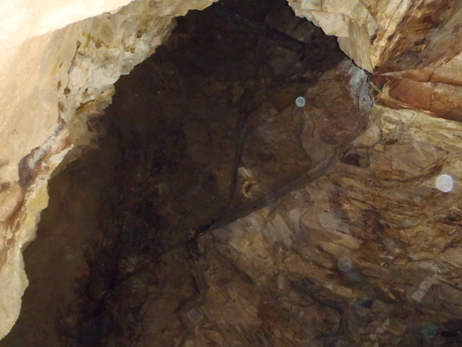 Soweit war das von oben schon zu sehen: Das ist nicht nur ein Überhauen, dort geht es in den Abbaublock. Und so weit man schauen kann: Der Block ist leer ! Von wegen "Teilsohlenabbau mit Versatz". Hier muß der Geigerzähler ausgeschlagen haben...