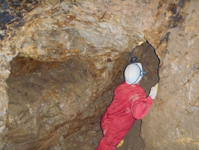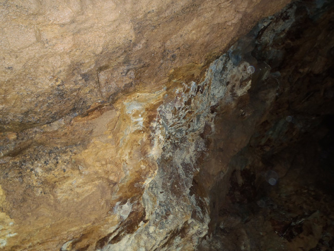 In dem frisch berissenen Stoß der Bruchpinge sieht man hier direkt einmal eine Art "Erzgang" anstehen: eine mylonitische Trümerzone mit viel erdig- dichtem Brauneisenstein und hellen Letten, die wohl auch hier auf die Zersetzung von Arsenkies im Kontakt mit den Atmosphärilien zurückgehen.