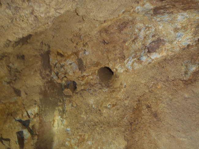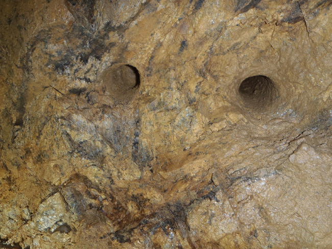 Auch hier haben unsere Großväter jede Menge Kontrollbohrungen in die Firste der Etagenstrecke hineingestoßen. Aber hier wird der Radiometrist festgestellt haben: Kein Uran vorhanden...