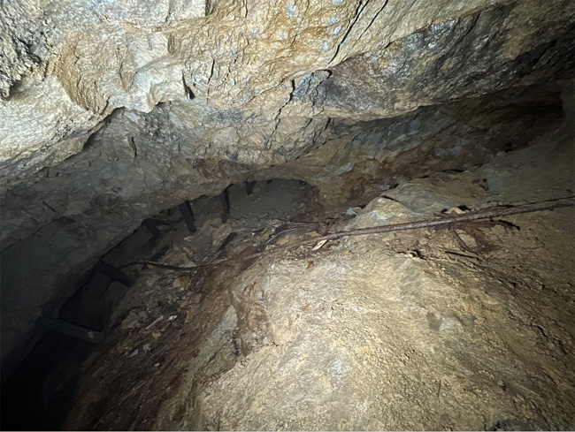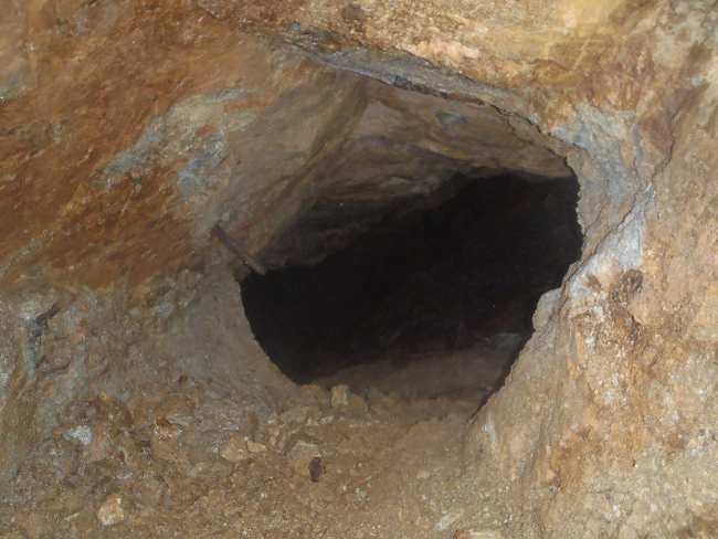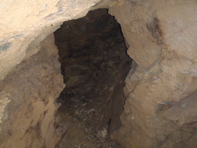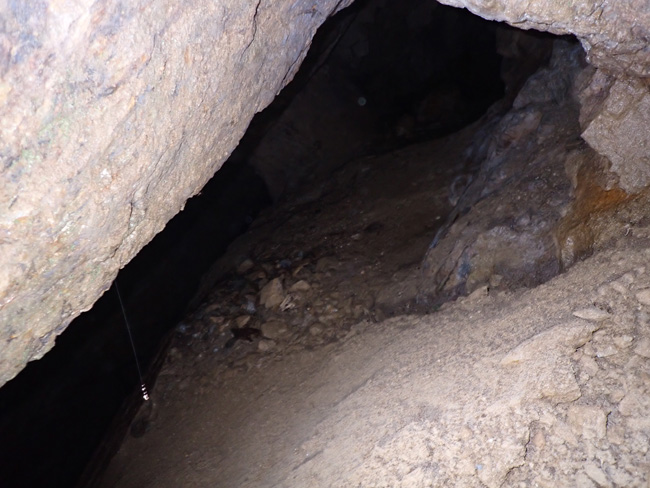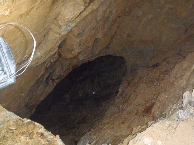 ![]() Der Blick nach Nordwesten: In eine Abbaugasse am oberen Ende des von der Stollnsohle aus ausgehauenen Blocks ? Ein Stück Förderseil und ein paar Druckluftschläuche lagen hier noch rum. Foto: SBN.