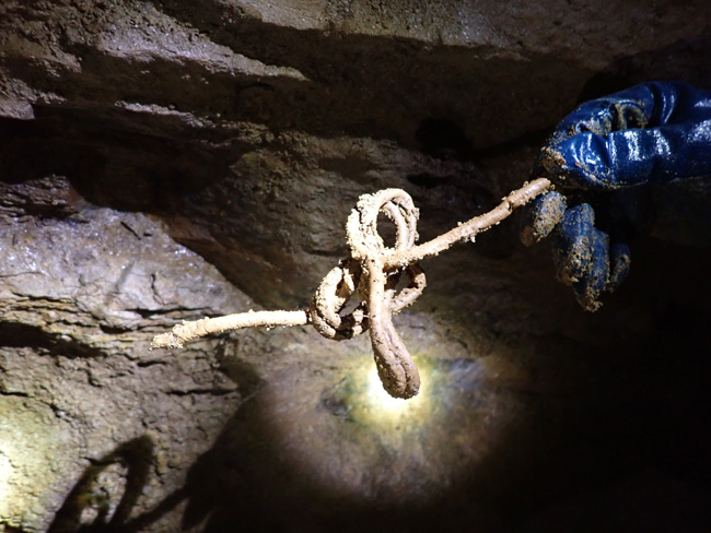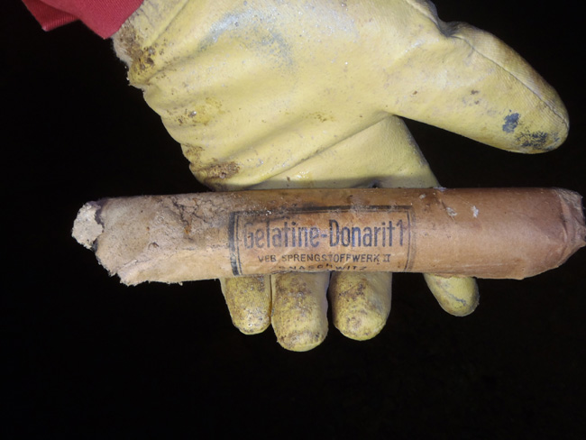 Dieses Fundstück wurde übrigens bei der Erstbefahrung noch aus einem der Bohrlöcher gezogen. Der Sprengstoff hatte sich natürlich längst aufgelöst, aber auf der Papphülle war noch gut zu lesen, daß diese Patrone 1951 im Sprengstoffwerk Gnaschwitz hergestellt worden ist... Vielleicht wäre das der letzte Schuß gewesen, der den Pfeiler zwischen der Etagenstrecke und dem Tiefschurf durchbrochen hätte ?