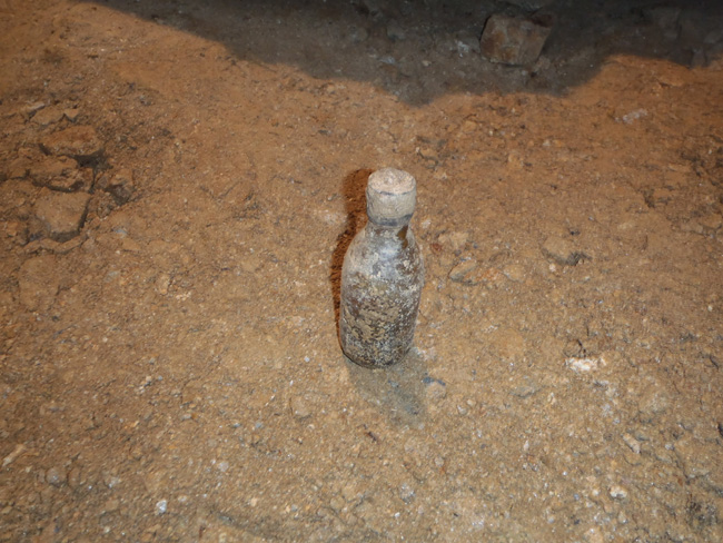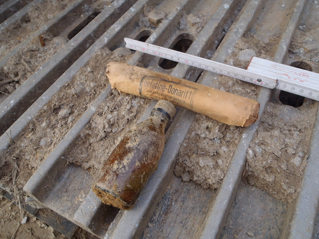 Die hatte wohl der Hauer für die nächste Schicht gleich vor Ort gelassen: Ein Arzneifläschchen, das wohl als Behälter für Reserveöl für den Bohrhammer diente - jedenfalls war eine zähe, ölige Flüssigkeit noch drin...